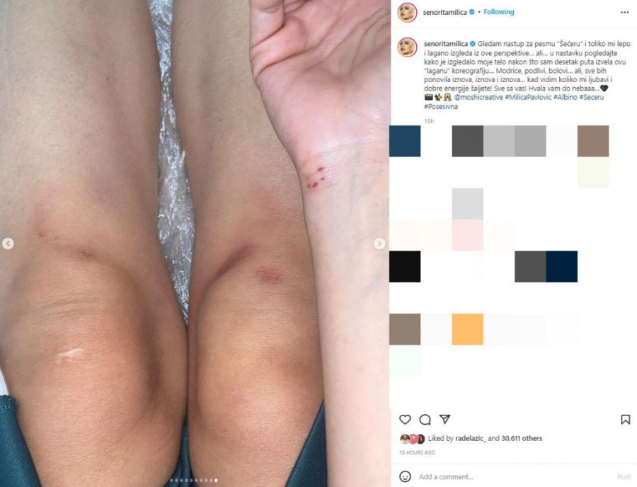 - Gledam nastup za pesmu "Šećeru" i toliko mi lepo i lagano izgleda iz ove perspektive… Ali… U nastavku pogledajte kako je izgledalo moje telo nakon što sam desetak puta izvela ovu laganu koreografiju… Modrice, podlivi, bolovi… Ali, sve bih ponovila iznova, iznova i iznova… Kad vidim koliko mi ljubavi i dobre energije šaljete! Sve za vas! Hvala vam do neba - napisala je Milica pored ovih fotografija.