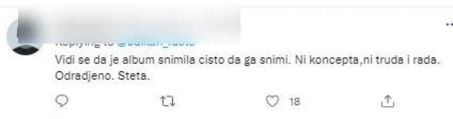 - "Seka je ozbiljna legenda i ona se može vratiti ponovo, kad god poželi", "Prevelika je ona zvezda da tako lako padne u zaborav, ali da se "zatrkala" bezveze sa ovih šest pesmica, jeste", "Vidi se da je album snimila čisto da ga snimi. Ni koncepta, ni truda, ni rada. Odrađeno, šteta", "Šteta što je kopirala pesmu "Rane" od Azisa, ali sve komplet, velika šteta" - pisali su tviteraši, dok je Sekin komentar, kao poznate tviterašice, izostao.