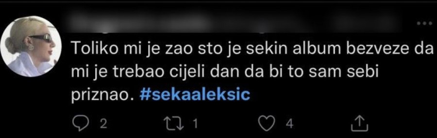 - 14 dana kasnije, samo jedna pesma sa albuma "Bioskop" premašuje milion pregleda na Jutjubu. Mnogi Sekini hitovi će živeti večno, ali da li ovaj album zapravo označava kraj jedne od najuspešnijih karijera 21. veka? - stoji na jednoj poznatoj stranici na Tviteru, koja se bavi zanimljivostima sa Balkana iz sfere muzike.