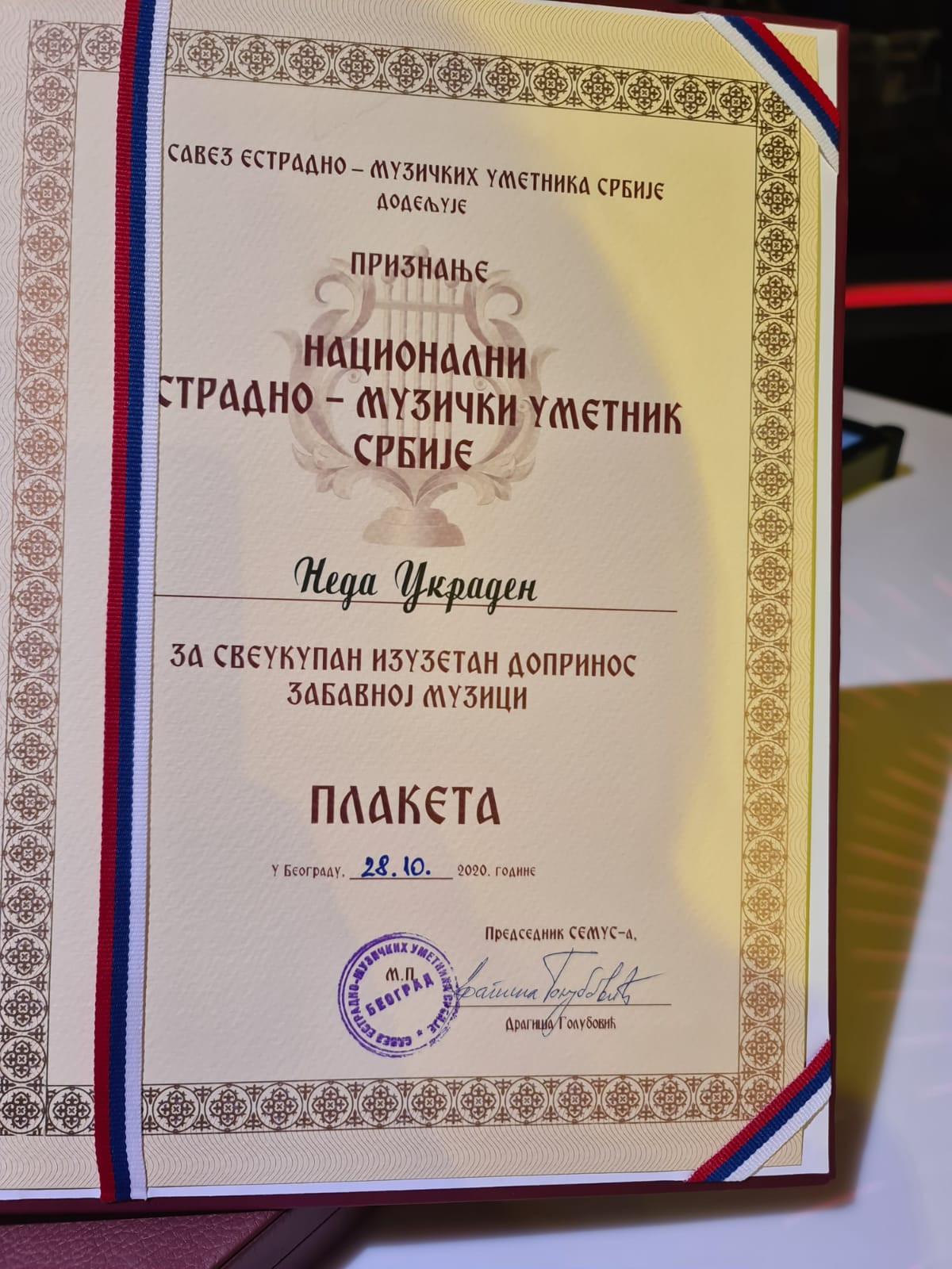 Uživo u programu RTS-a Neda Ukraden dobila je priznanje Nacionalni estradno-muzički umetnik Srbije za sveukupan doprinos zabavnoj muzici.