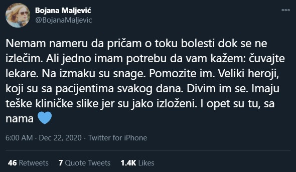 Tri dana kasnije, ponovo se oglasila na pomenutoj društvenoj mreži, pa istakla da o svom zdravlju dalje neće pričati dok se u potpunosti ne bude izlečila. Jedno je, ipak, morala – da izrazi divljenje koje oseća prema lekarima, te poruči svima da ih čuvaju u ova vremena.