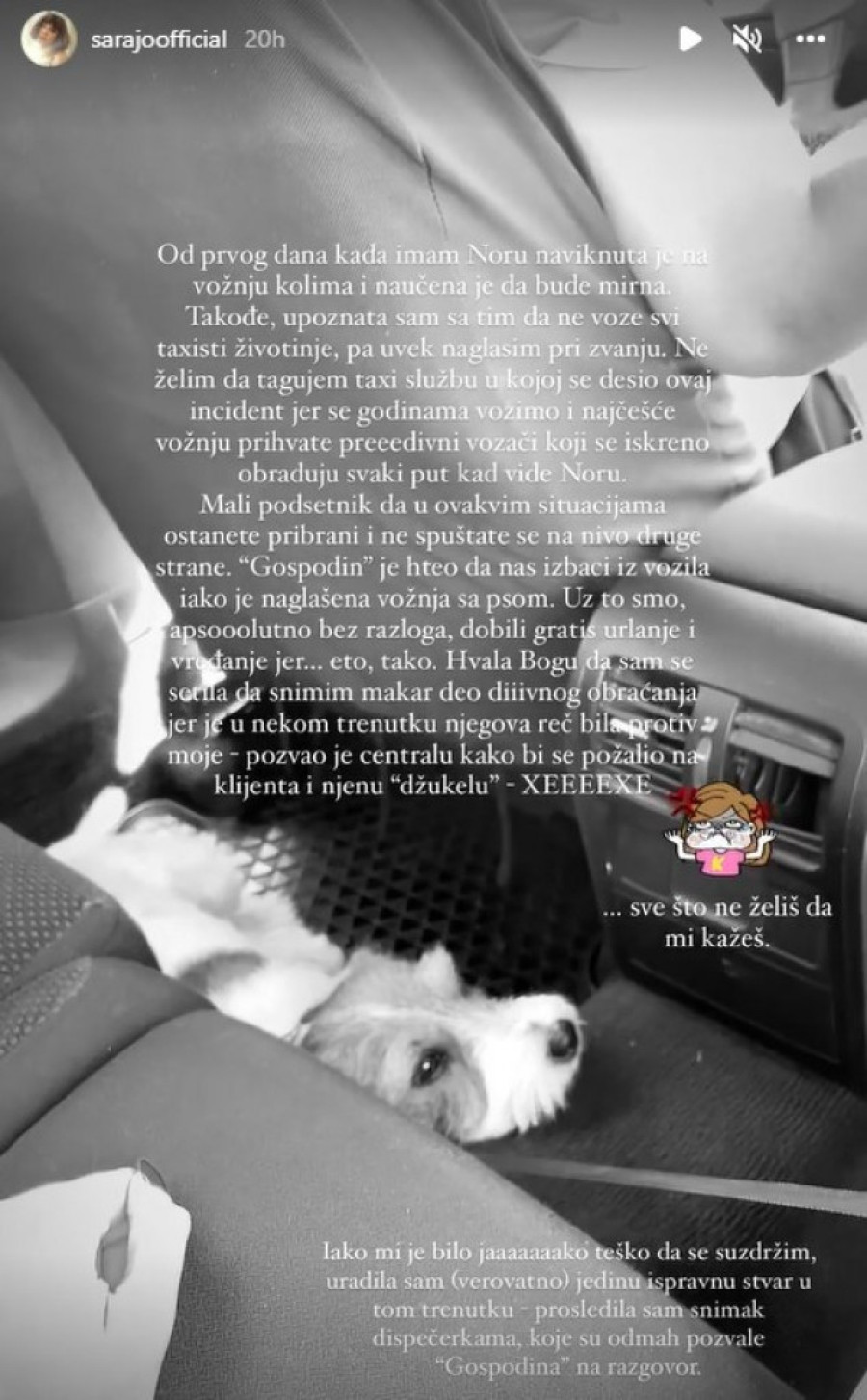 - Od prvog dana kada imam Noru naviknuta je na vožnju kolima i naučena je da bude mirna. Takođe, upoznata sam sa tim da ne voze svi taksisti životinje, pa uvek naglasim prvi zvanju. Ne želim da tagujem taksi službu u kojoj se desio ovaj incident jer se godinama vozimo i najčešće vožnju prihvate predivni vožači koji se iskreno obraduju svaki put kad vide Noru. Mali podsetnik da u ovakvim situacijama ostanete pribrani i ne spuštate se na nivo druge strane - nastavila je Sara.
