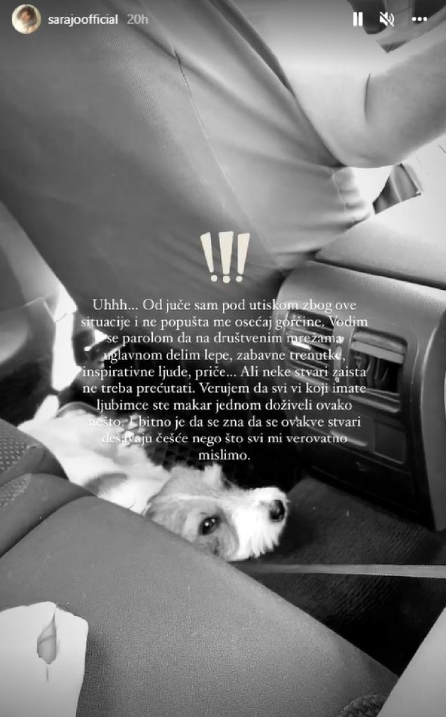 - Uh... Od juče sam pod utiskom zbog ove situacije i ne pušta me osećaj gorčine. Vodim se parolom da na društvenim mrežama uglavnom delim lepe, zabavne trenutke, inspirativne ljude, priče... Ali neke stvari zaista ne treba prećutati. Verujem da ste svi vi koji imate ljubimce makar jednom doživeli ovako nešto. I bitno je da se zna da se ovakve stvari dešavaju češće nego što mi svi verovatno mislimo - započela je Sara.
