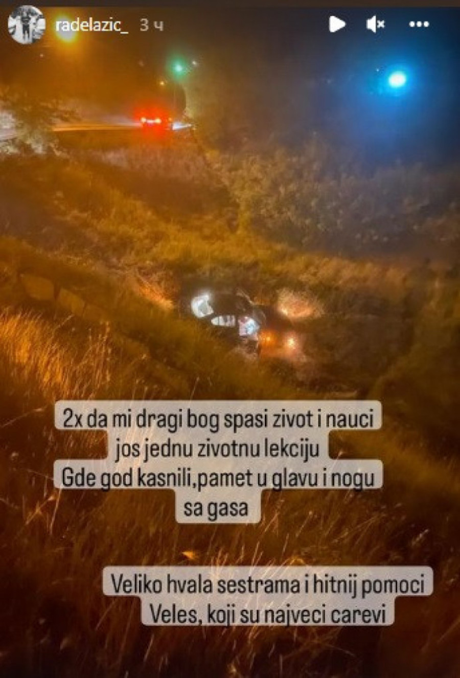 "Drugi put mi dragi Bog spasi život i nauči me još jednu životnu lekciju. Gde god kasnili, pamet u glavu i nogu sa gasa", napisao je Rade na Instagramu.