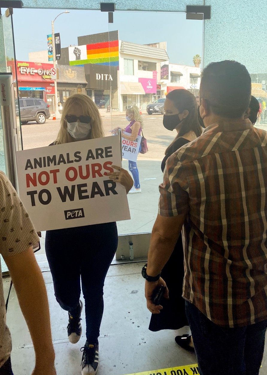 Glumica je bila u kupovini sa sinom Paksom (16) u jednom tržnom centru u zapadnom Holivudu, a na izlazu se susrela sa aktivistima od kojih nije mogla da prođe. Oni su nakon toga upali u radnju, a glumica, koja se i sama zalaže za zaštitu životinja, nije se mešala.