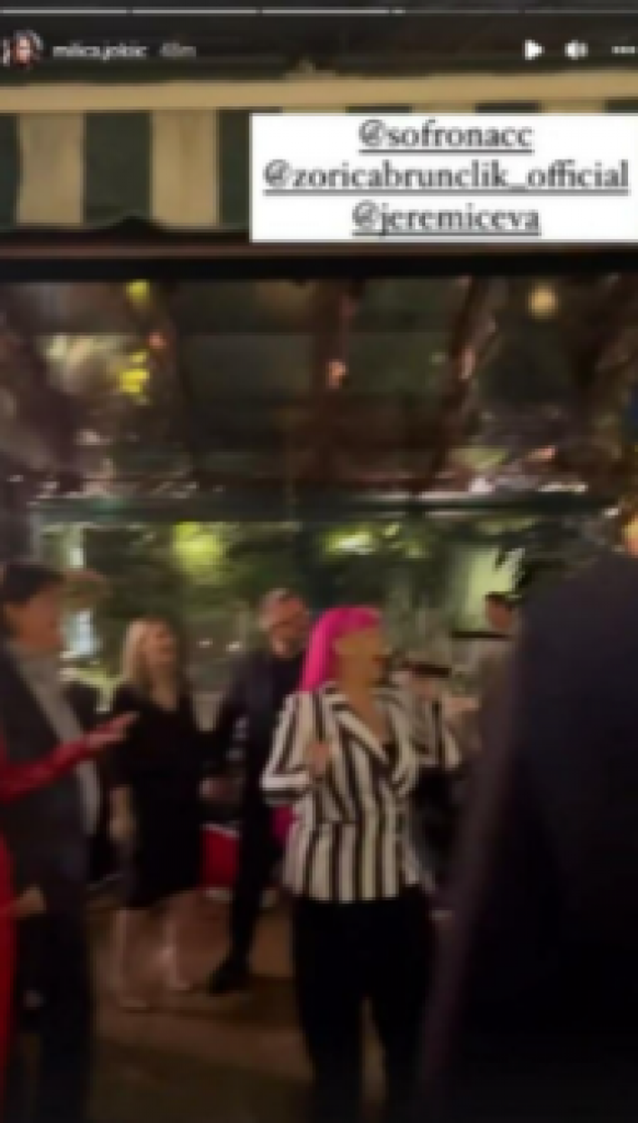 Nakon prvog mladenačkog plesa, atmosfera u prestoničkom restoranu je iz trenutka u trenutak bila sve vrelija. Brojne kolege Mire Škorić su se latile mikrofona, a prva među njima je pevačica Zorica Brunclik koja je za mladence otpevala pesmu „Kada bi me pitali“.