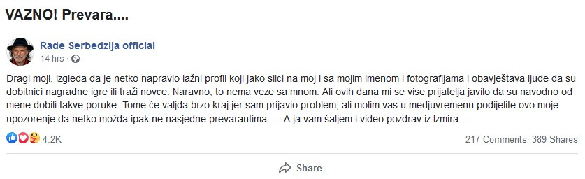 Nakon što je neko napravio lažni profil, predstavljajući se kao poznati glumac i muzičar, Rade Šerbedžija oglasio se na Fejsbuku pa upozorio javnost da ne nasedaju na prevaru. U kratkom snimku iz Turske, gde trenutno boravi, rekao je i da je odmah prijavio problem, te da se nada brzom razrešenju situacije.