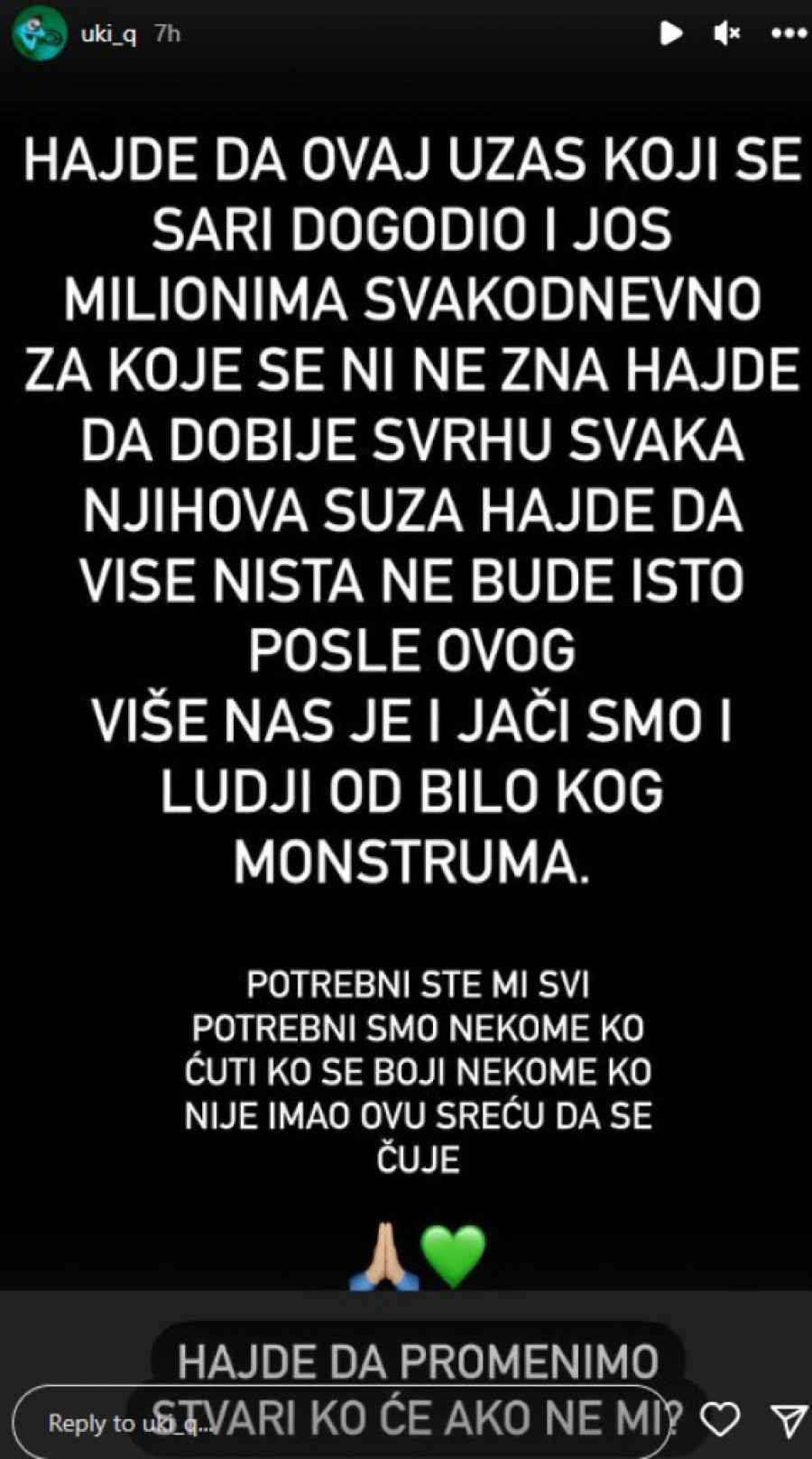 - Hajde da ovaj užas koji se desio Sari i još milionima svakodnevno za koje se ni ne zna, hajde da dobije svrhu svaka njihova suza, hajde da više ništa ne bude isto posle ovoga! Više nas je i jači smo i luđi od bilo kog monstruma. Potrebni ste mi svi, potrebni smo nekome ko ćuti i boji se, nekom ko nije imao ovu sreću, da se čuje. Hajde da promenimo stvari, ko će, ako ne mi - napisala je Una koja je dodala i da joj nakon priče o nasilju nad Sarom, stižu razne poruke žena koje su doživele slične situacije, kao i fotografije njihovih povreda.