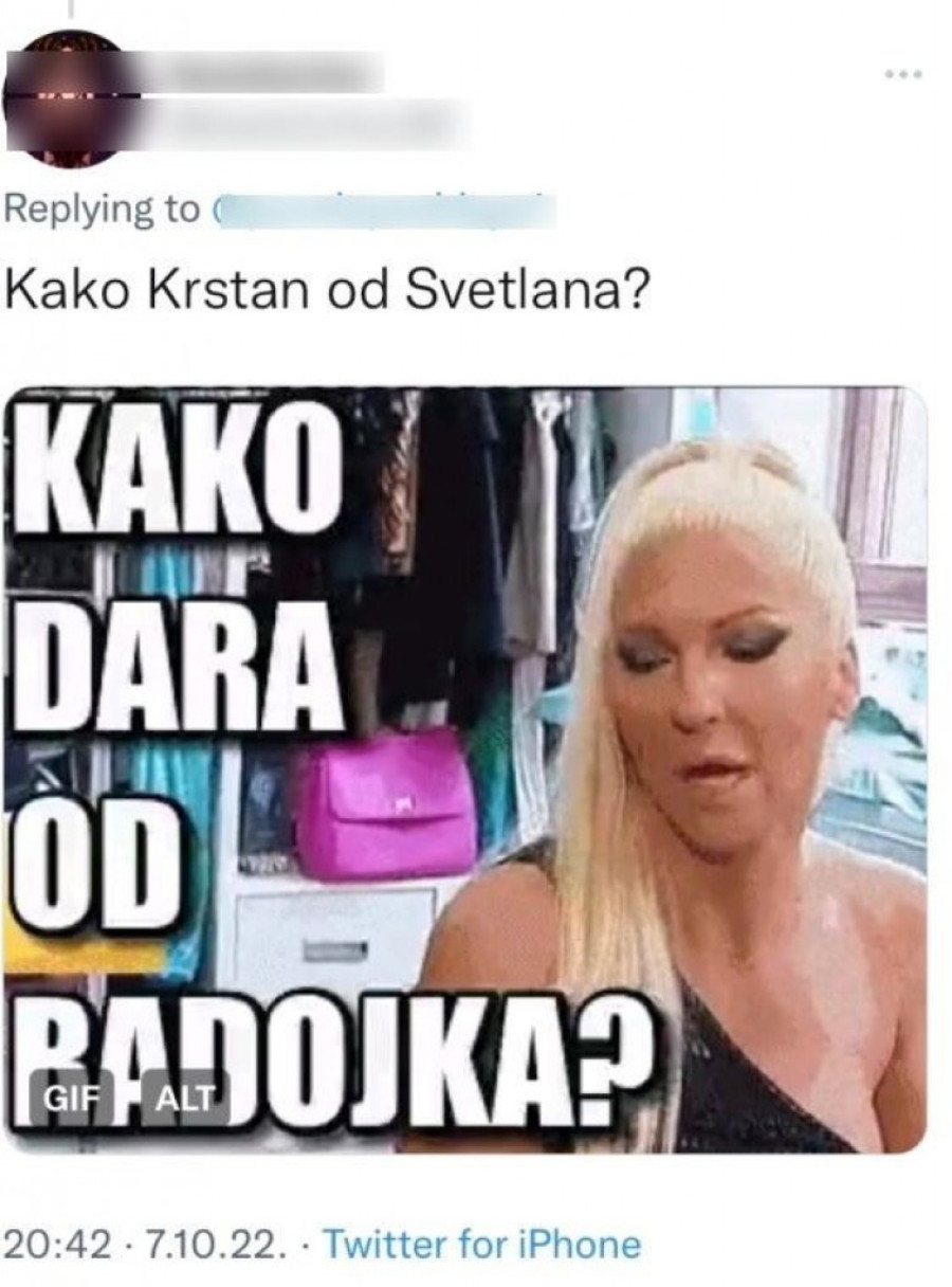 - Kako Krstan od Svetlana? - postala je jedna od glavnih tema, akonto dobro poznatog pitanja Cecine rivalke Jelene Karleuše, upućene kolegiici Dari Bubamari („Kako Dara od Radojka").