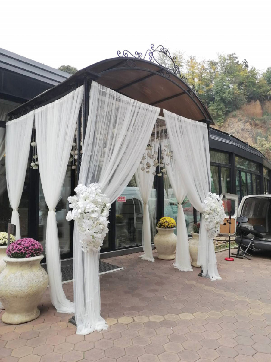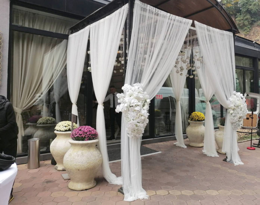 Mladenci su se pobrinuli i da dekoracija bude na zavidnom nivou, te je sam ulaz u salu ukrašen belim zavesama, i brojnim cvetovima u istoj boji.