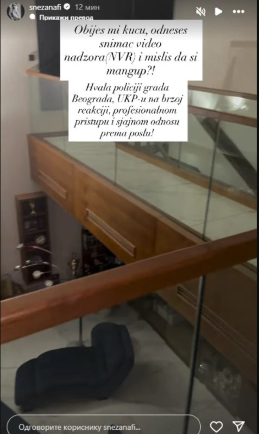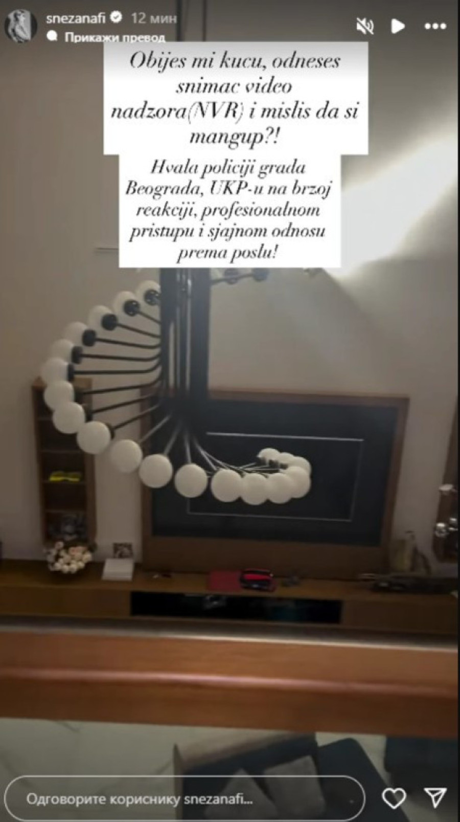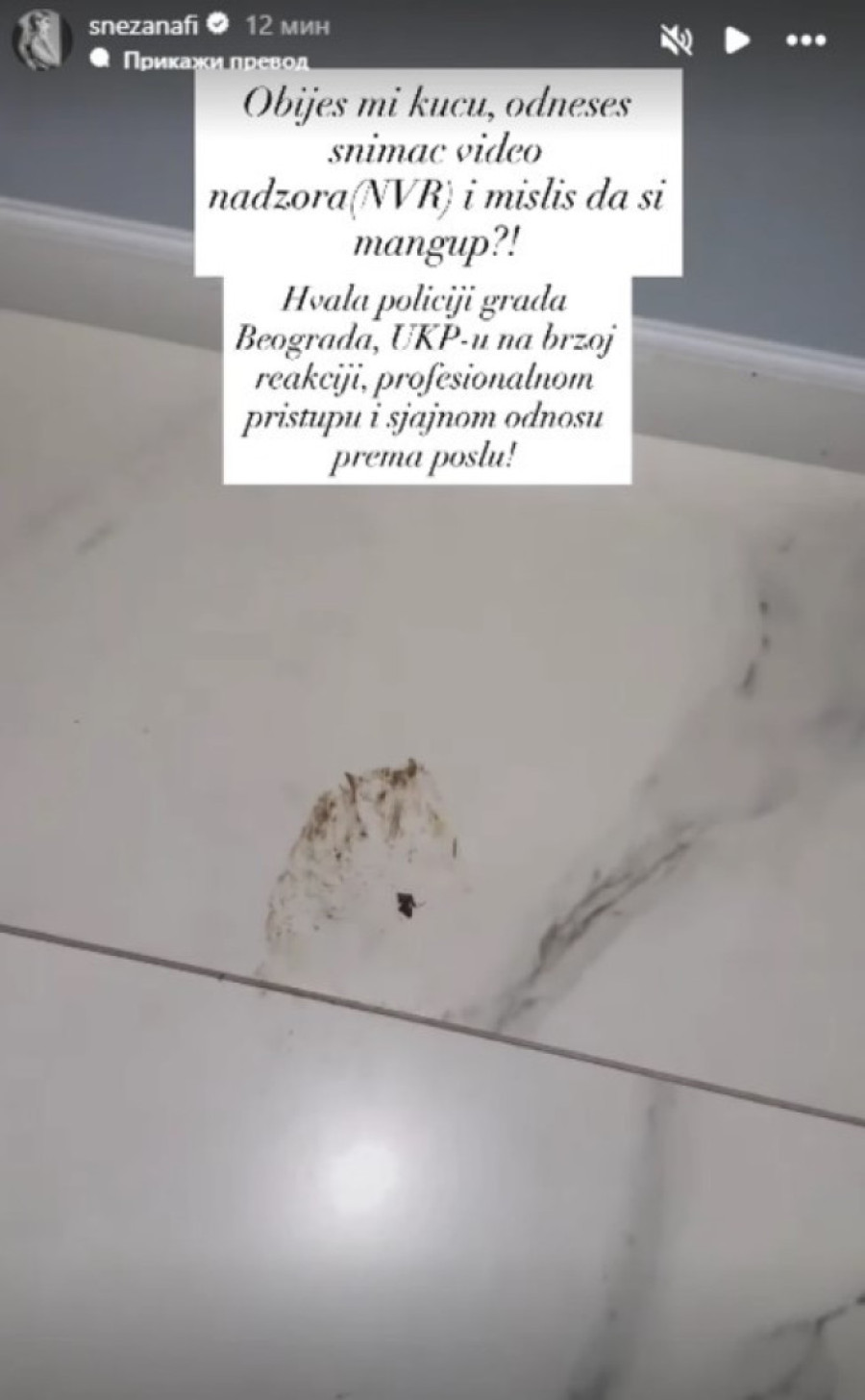 - Obiješ mi kuću, odneseš snimač video nadzora i misliš da si mangup. Hvala policiji grada Beograda na brzoj reakciji i sjajnom odnosu prema poslu - napisala je Snežana na svom nalogu na Instagramu, podelivši fotografije iz njene kuće.