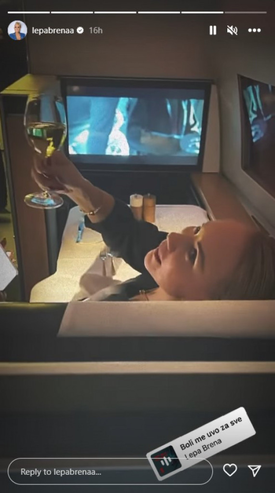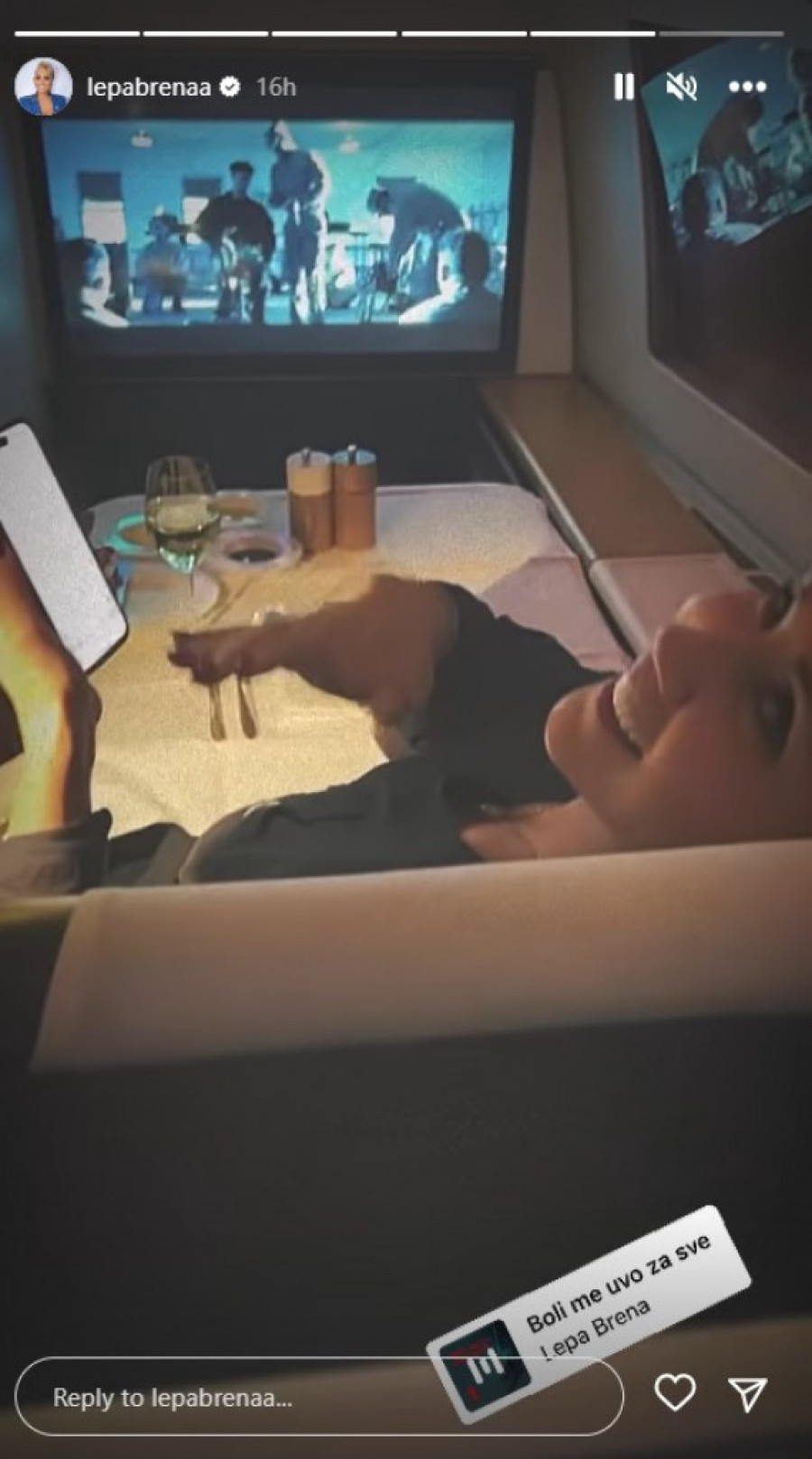 Brena je sada podelila snimak iz aviona u kojem se vidi kako leži na kožnim sedištima ispred televizora, u avionu švajcarske avio kompanije. Ona je nasmejana, iz prve klase, sa čašom penušavog vina u ruci pozdravila svoje pratioce na društvenim mrežama i time izazvala brojne komentare, poput: "Brena zna da uživa", "Svaka čast", "Prelepo izgleda", "Divim joj se"...