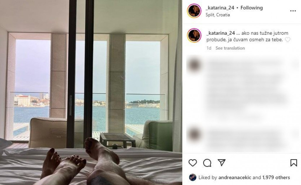 - ...Ako nas tužne jutrom probude, ja čuvam osmeh za tebe - potpisala je ona svoju objavu delićem iz čuvene „Moj lipi anđele", pošto je ispozirala s Darkom u krevetu.