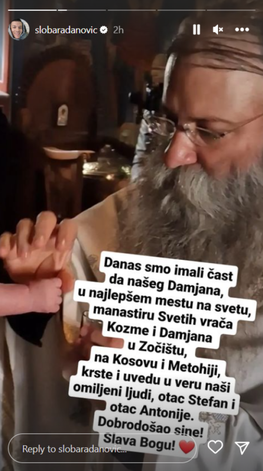 - Danas smo imali čast da našeg Damjana u najlepšem mestu na svetu, manastiru Svetih vrača Kozme i Damjana u Zočištu, na Kosovu i Metohiji, krste i uvedu u veru, naši omiljeni ljudi, otac Stefan i otac Antonije. Dobrodošao sine! Slava Bogu - napisao je Sloba uz fotografiju sa krštenja.