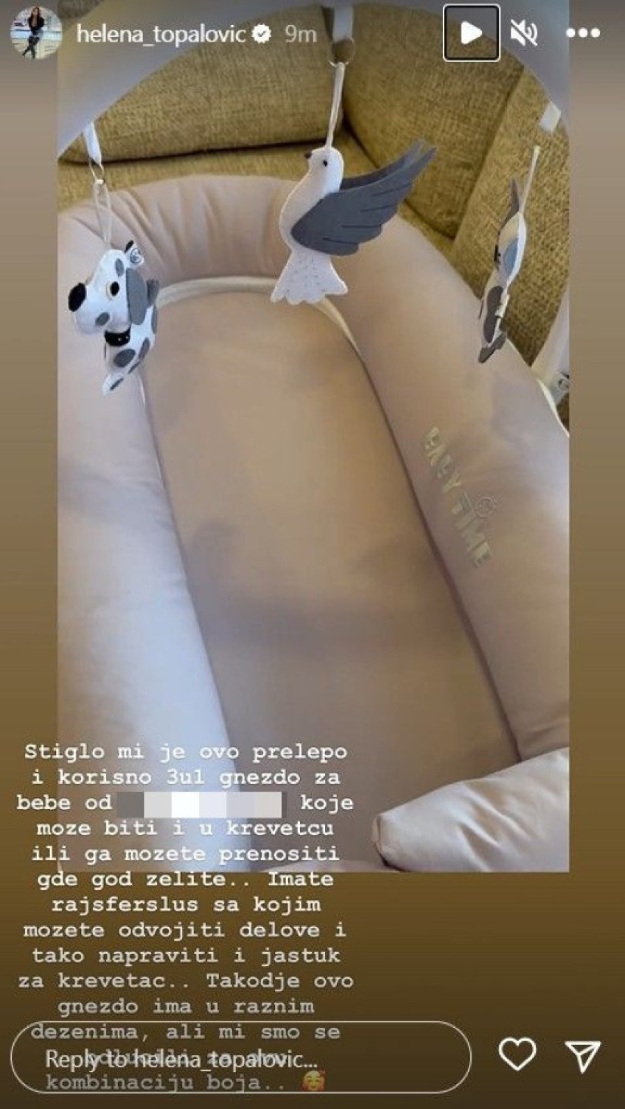 - Stiglo nam je ovo prelepo i korisno tri u jedan gnezdo za bebe, koje može biti u krevecu ili ga možete prenositi gde god želite. Imate rajsferšlus sa kojim možete odvojiti delove i tako napraviti i jastuk za krevetac... Takođe, ovo gnezdo ima u raznim dezenima, ali mi smo se odlučili za ovu kombinaciju boja - objašnjavala je ona, a zatim i pokazala skupocenu narukvicu koju je dobila i odmah je isprobala.