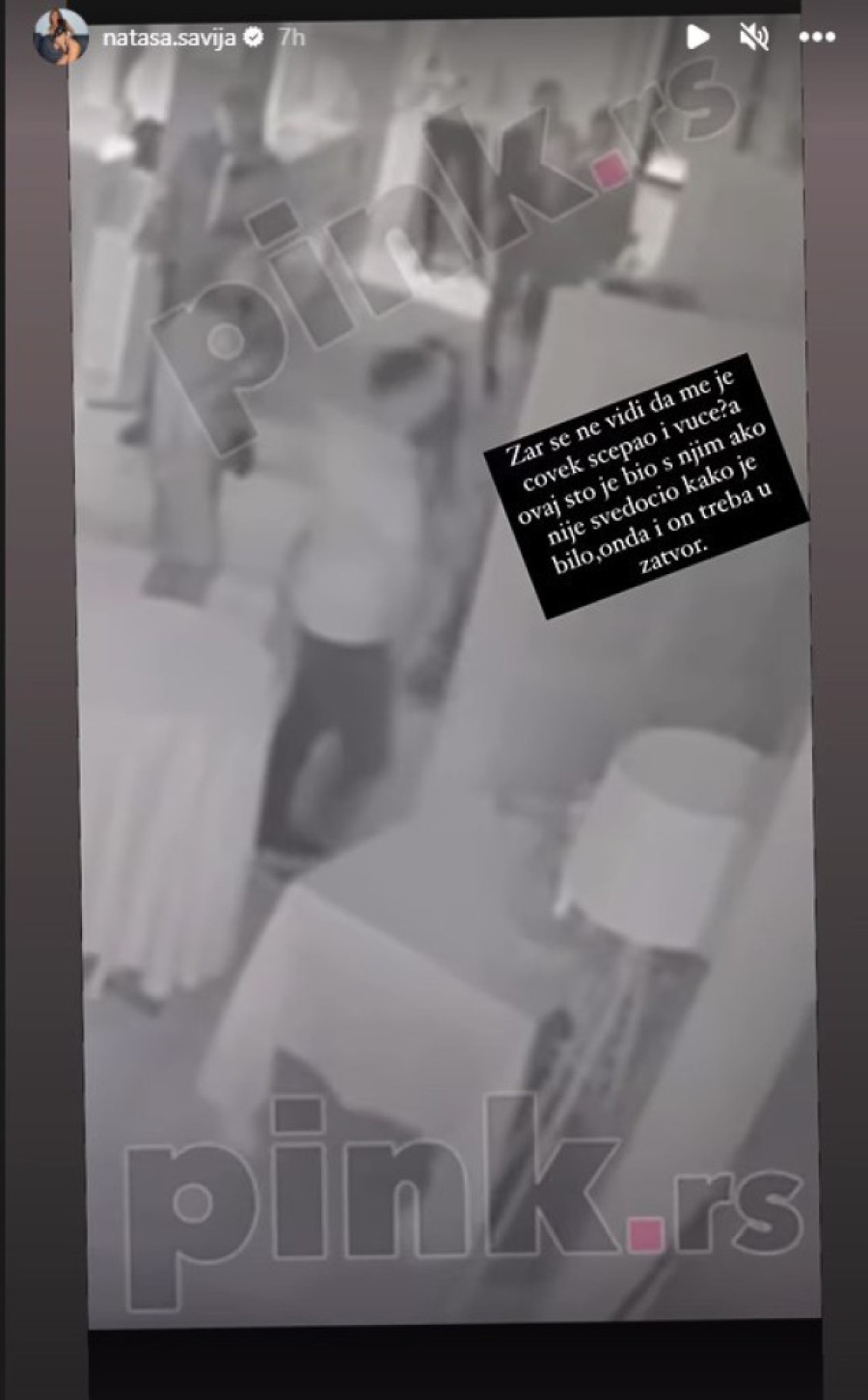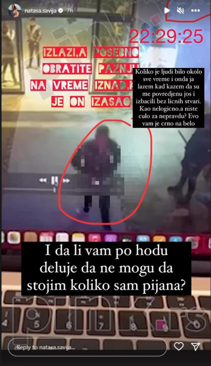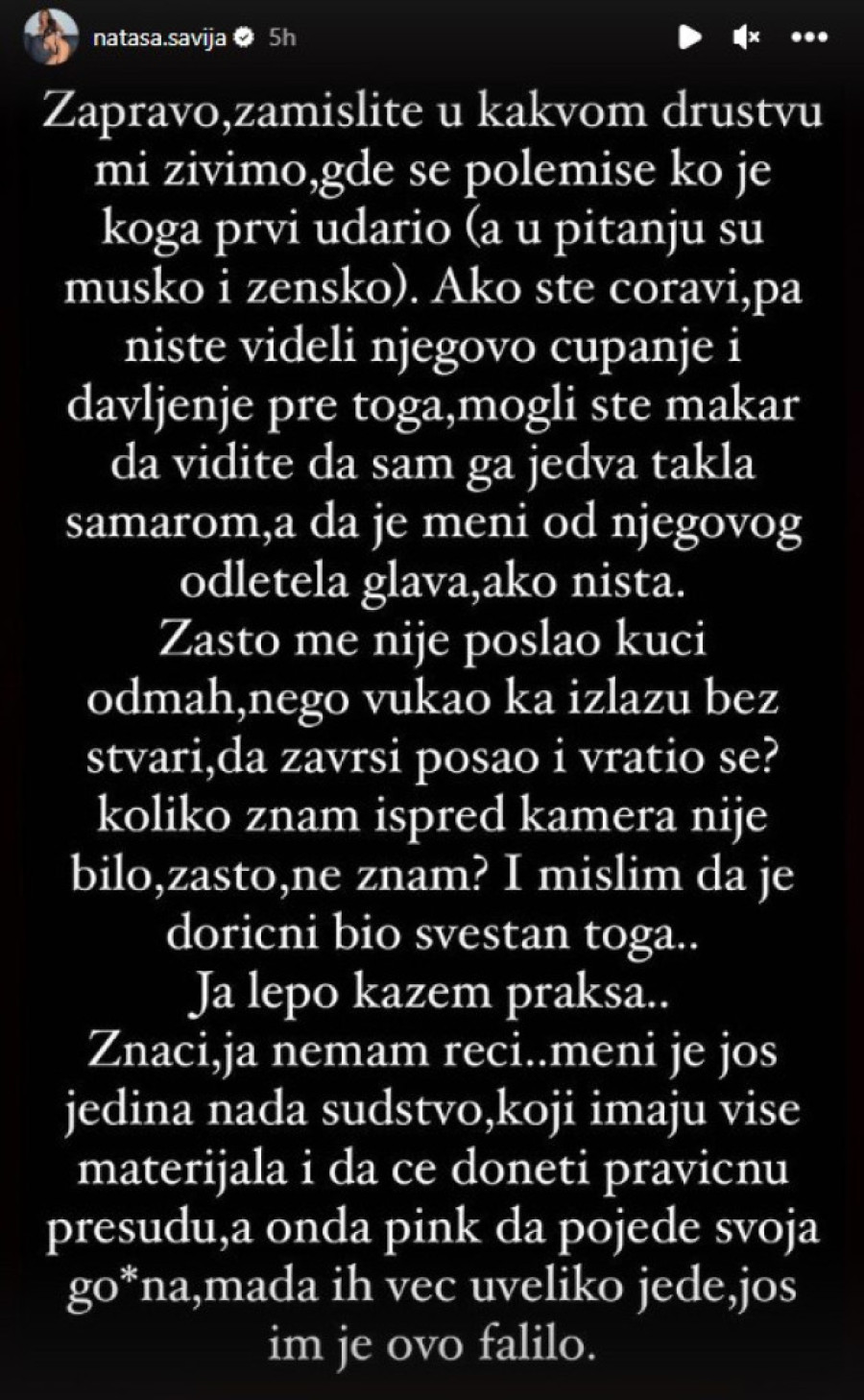 - Zamislite u kakvom društvu mi živimo, gde se polemiše ko je koga prvi udario (a u pitanju su muško i žensko). Ako ste ćoravi, pa niste videli njegovo čupanje i davljenje pre toga, mogli ste makar da vidite da sam ga jedva takla šamarom, a da je meni od njegovog odletela glava, ako ništa. Zašto me nije poslao kući odmah, nego vukao ka izlazu bez stvari, da završi posao i vratio se? Koliko znam, ispred kamera nije bilo, zašto, ne znam. I mislim da je dotični bio svestan toga. Ja lepo kažem praksa. Znači, ja nemam reči. Meni je još jedina nada sudstvo, koje ima više materijala, nadam se da će donet pravičnu presudu - poručila je Šavija na svom profilu.