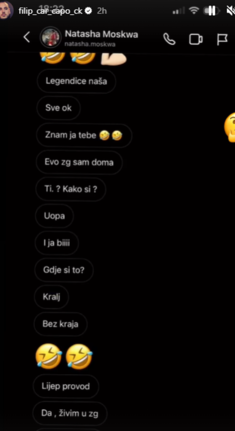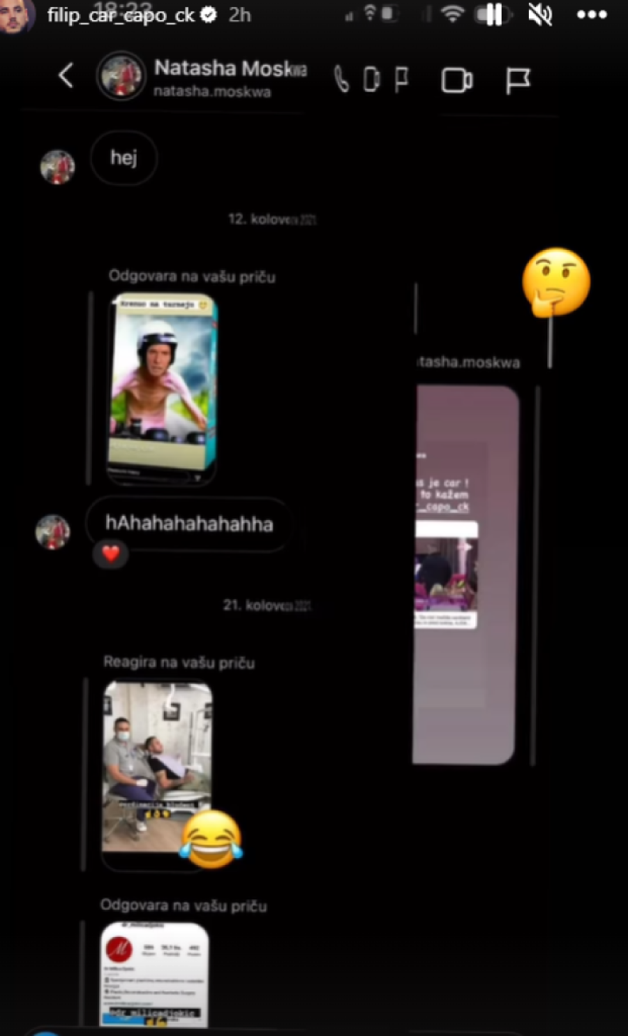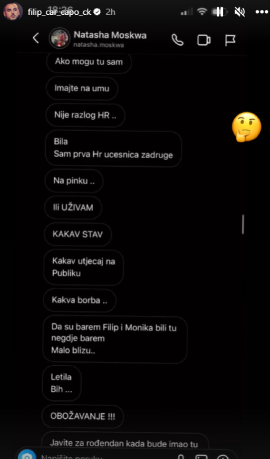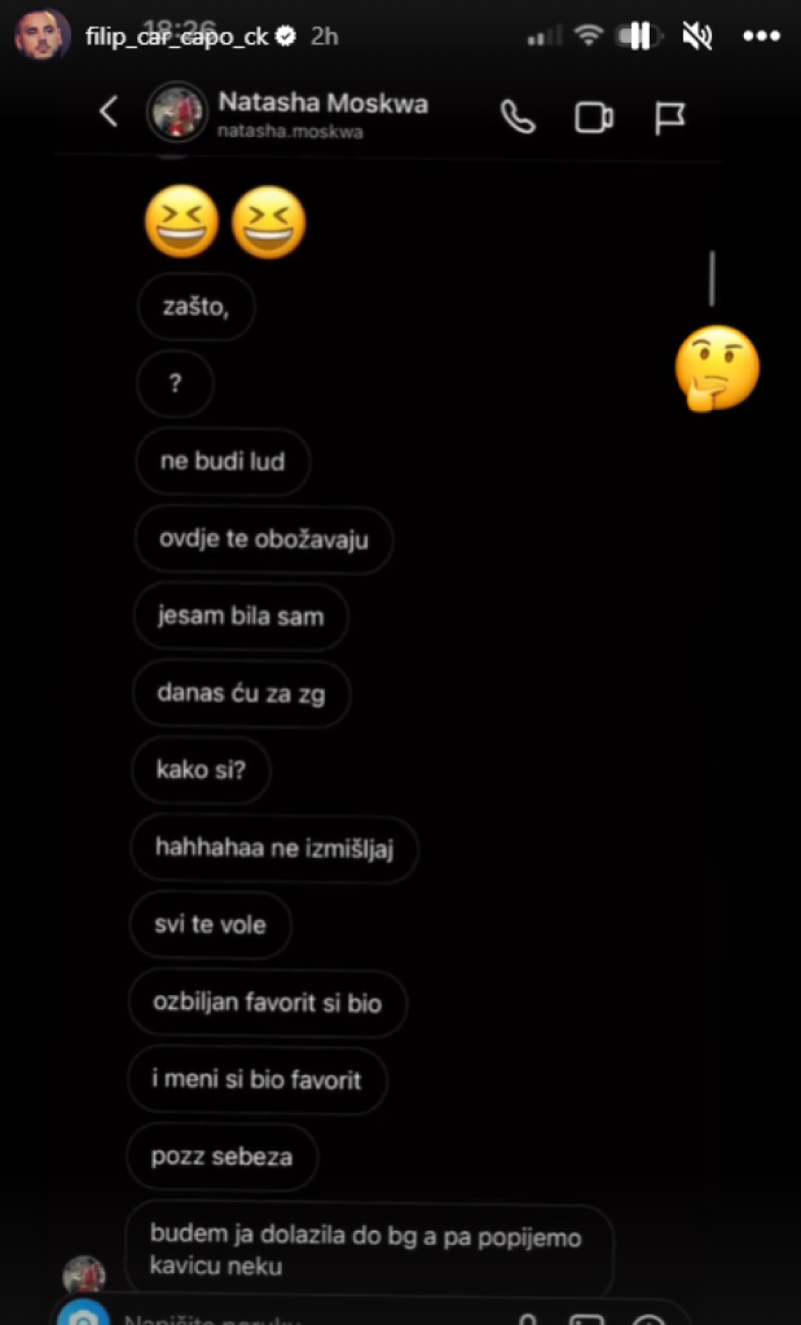 - Ovako! Nemam ništa sa Filipom, naporan je, dosadan je, zove na „video call" preko Instagrama, komentariše svaki stori i šalje poruke koje se samo jednom mogu otvoriti. Traži da mu šaljem fotografije - rekla je Nataša Moskva, pa spomenula njegovu verenicu Aleksandru Nikolić.