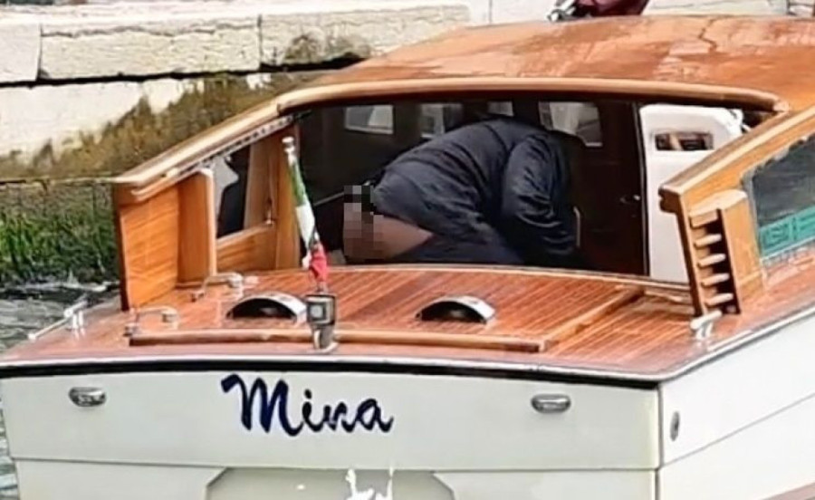 Reper je bio obučen u crno, dok je na licu imao masku. Sedeo je na povišenom i otvorenom delu brodića sa spuštenim pantalonama, a dok je njegova supruga klečala ispred njega, Vest je razgledao grad.