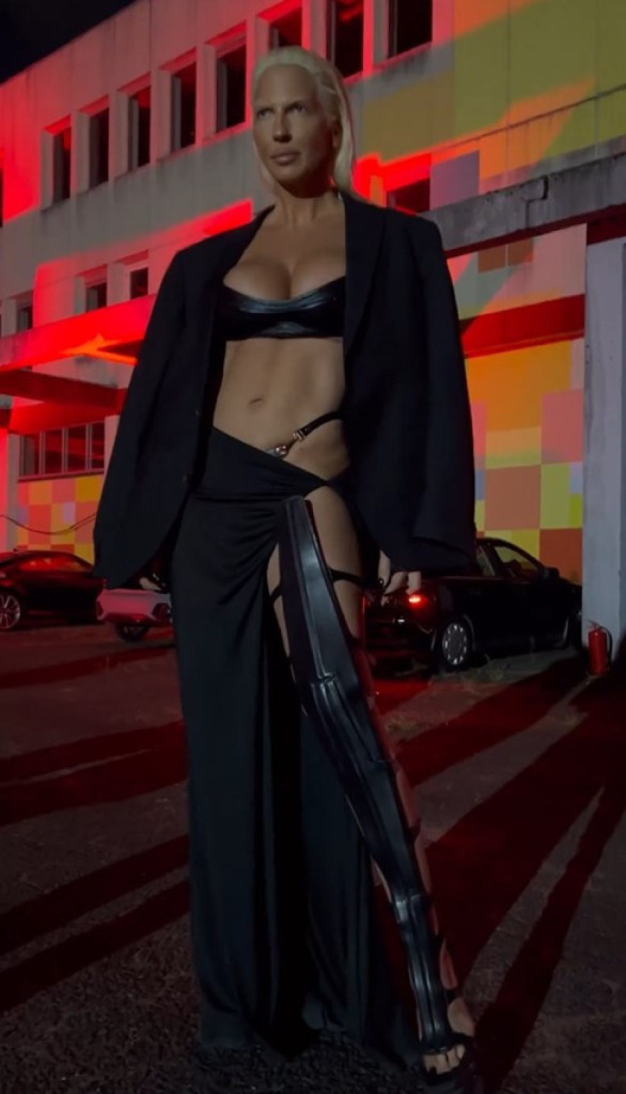 Zalizane plave kose, te u vrtoglavo visokim štiklama, zapalila je crveni tepih ovog događaja istakavši takođe i svoju zavidnu figuru u crnom topu i „isečenoj" suknji u istom tonu.