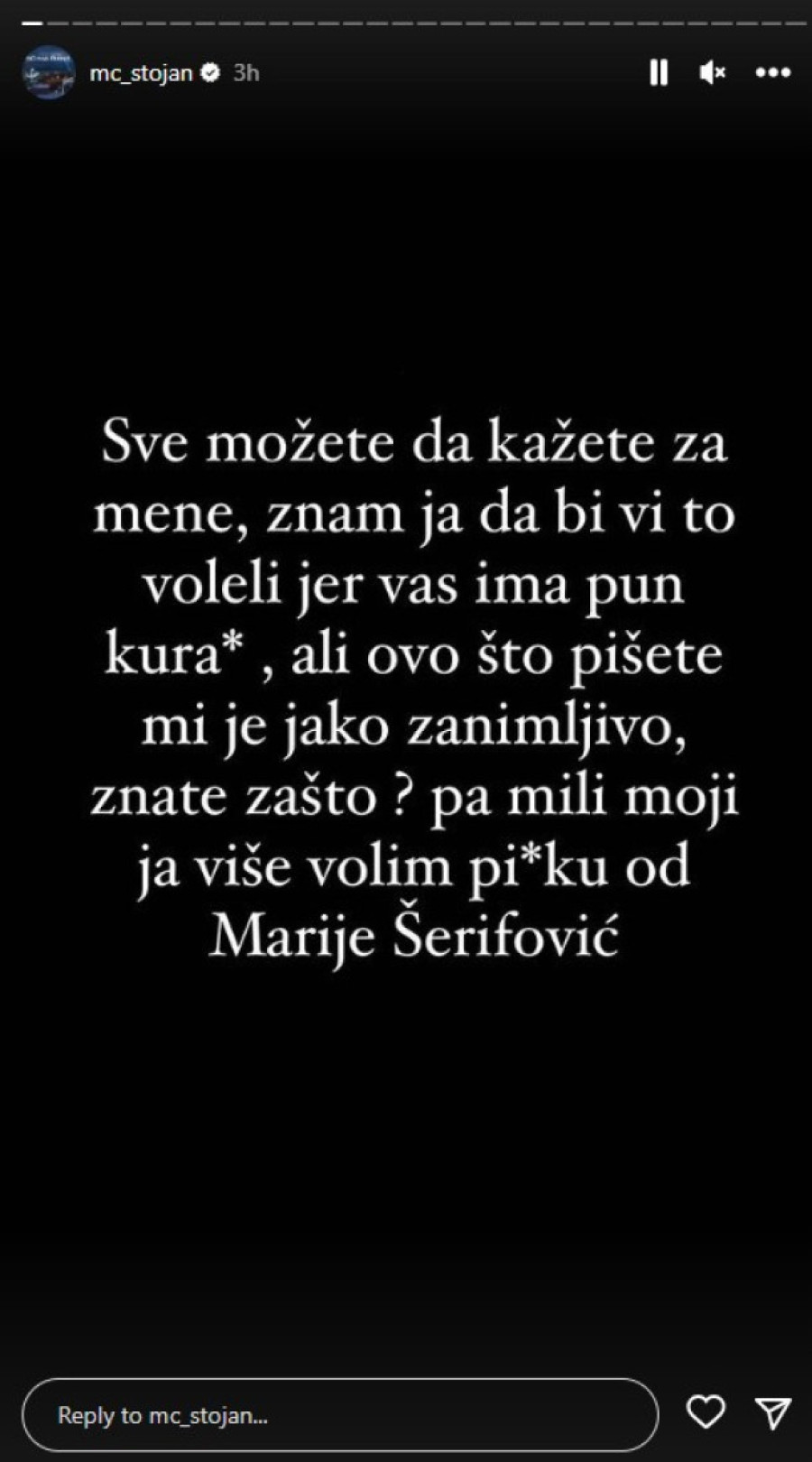 - Sve možete da kažete za mene, znam ja da bi vi to voleli jer vas ima pun k***c, ali ovo što pišete jako mi je zanimljivo, znate zašto? Pa mili moji, ja više volim p***u nego Marija Šeriović - šokirao je Stojan, pa dodao:
