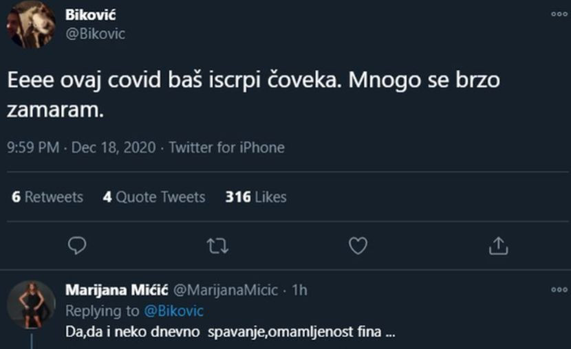 – Eeee ovaj covid baš iscrpi čoveka. Mnogo se brzo zamaram – napisao je Biković.