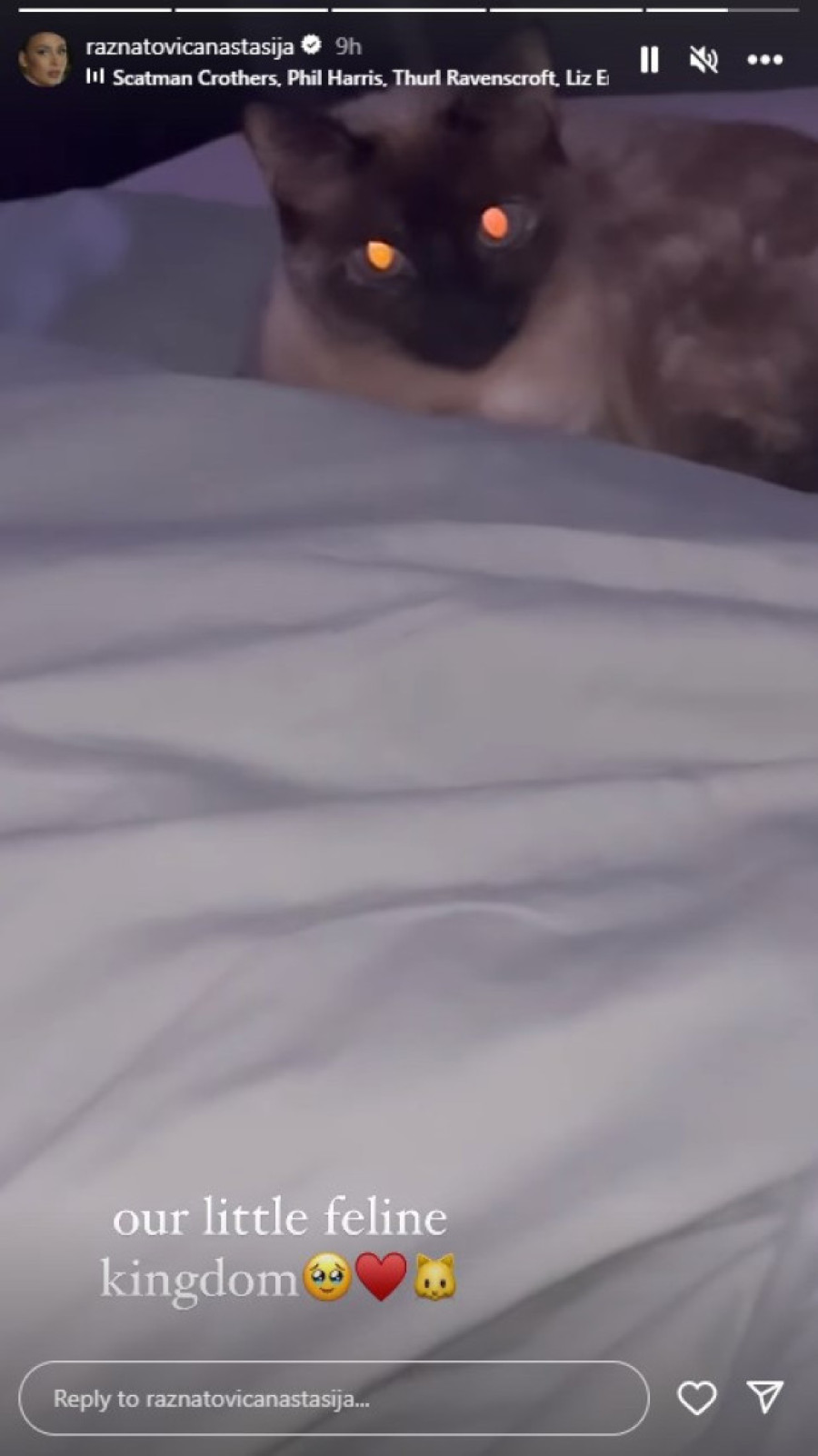 Naime, u kasnim večernjim satima, Anastasija je snimala krevet na kojem je bilo tačno pet mačaka. Takođe, može se videti i da je Gudeljima na televiziji upaljen rijaltii "Elita".