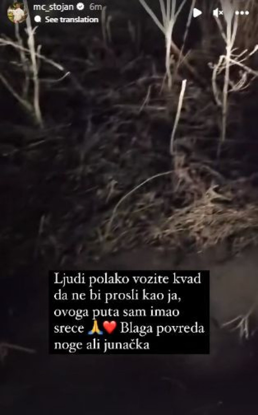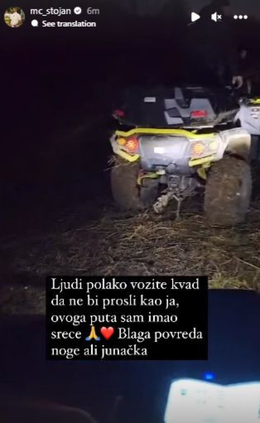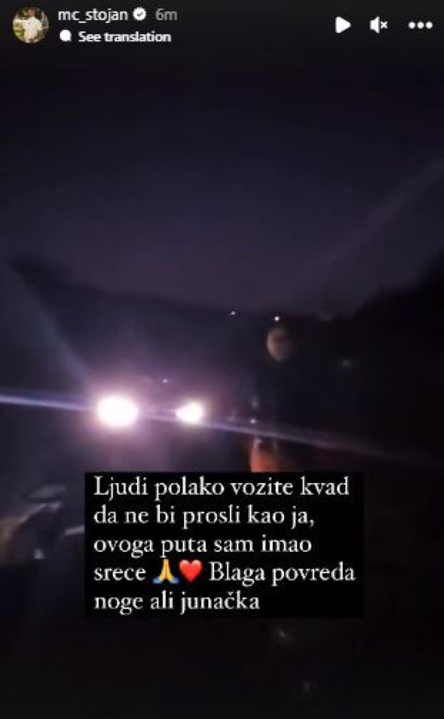 Marko Stojković, poznatiji kao MC Stojan, doživeo je nezgodu vozeći kvad. U jeku drame, on se oglasio na svom Instagramu pa je pred svojim fanovima otvorio dušu, istakavši kako je „ovoga puta imao sreće".