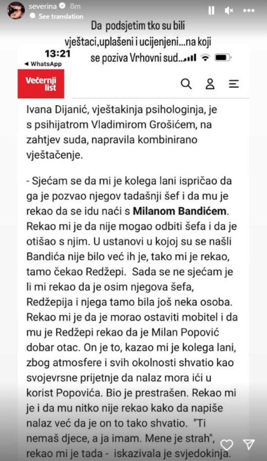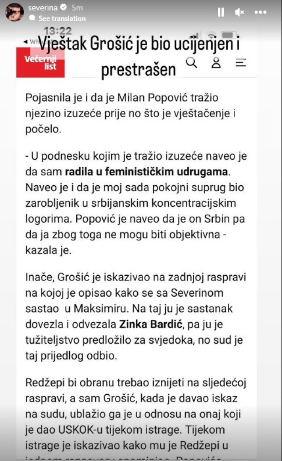 Ona se posle izjave za hrvatske medije, da će se boriti do poslednje kapi krvi, oglasila i na Instagramu te ponovila da su „veštaci bili potkupljeni i ucenjeni", a naročito je istakla „veštaka Grošića koji je bio prestrašen".
