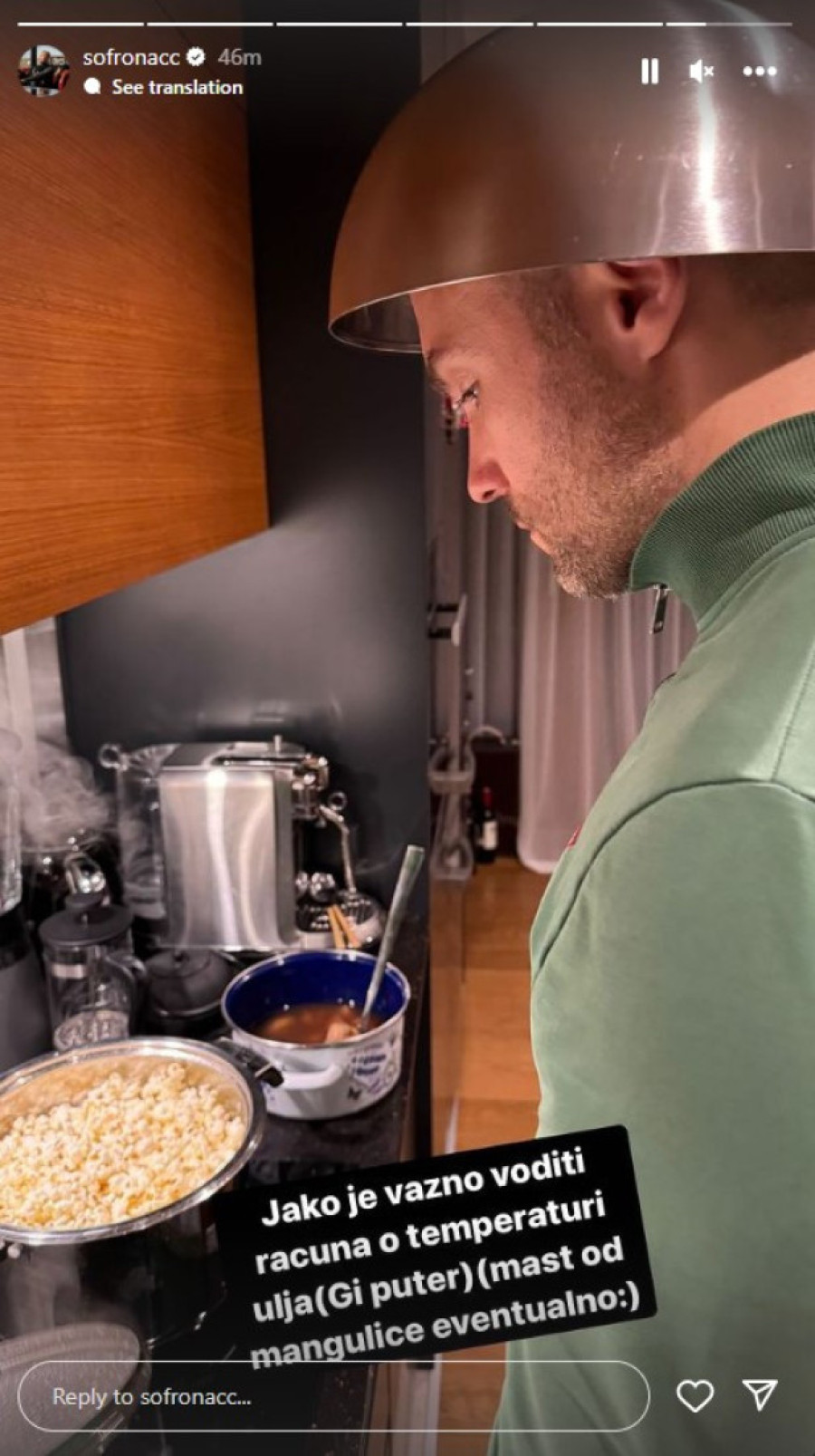 Izgleda da uživa u poslovima u kuhinji, te objavio sliku sa šerpom u rukama i činijom na glavi, pa napisao: "Popcorn master".