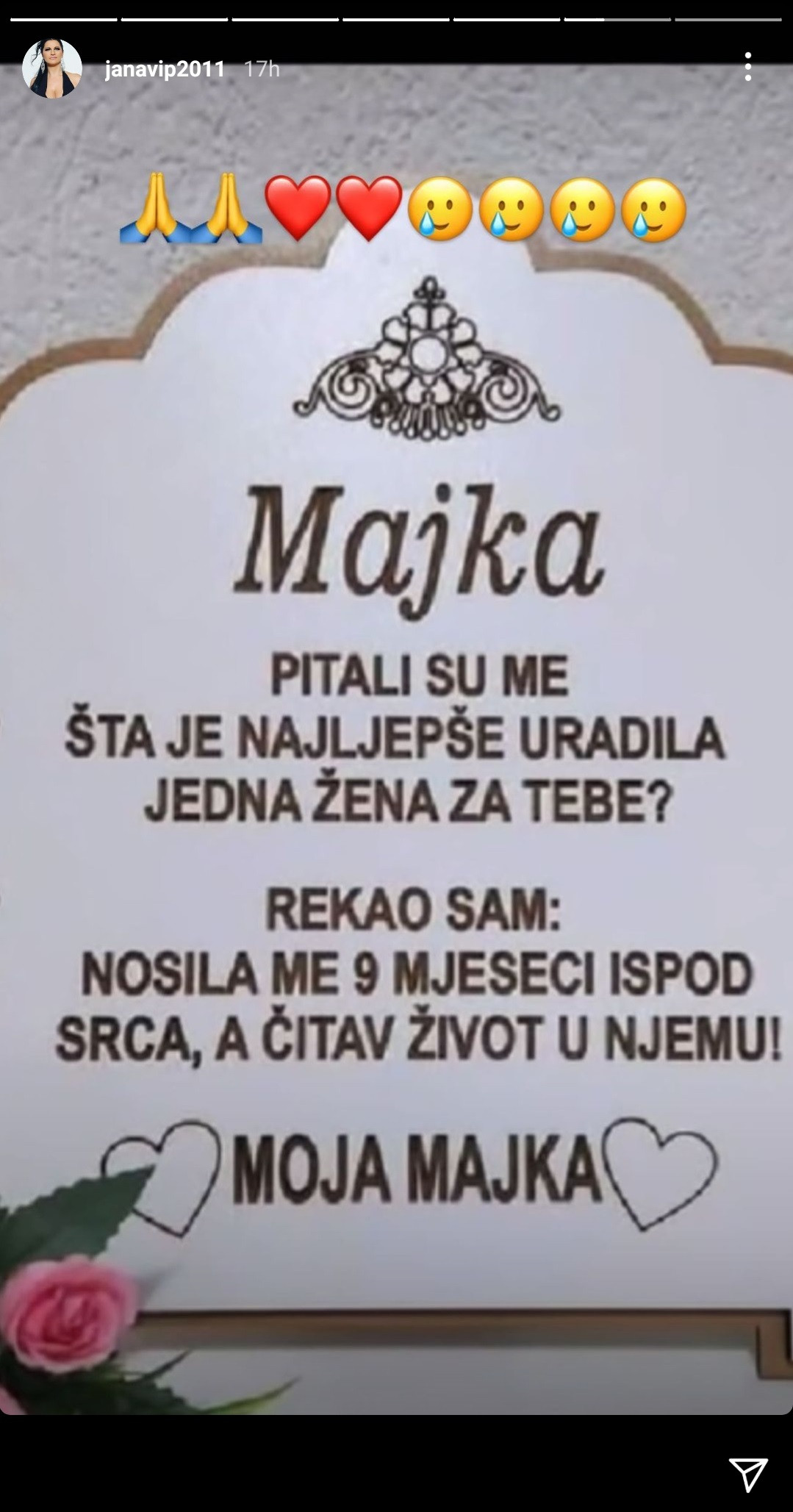 – Majka. Pitali su me šta je najlepše što je uradila jedna žena za tebe? Rekao sam: „Nosila me je devet meseci ispod srca, a čitav život u njemu” – glasi poruka, koja je pevačicu navela na ovakav potez.