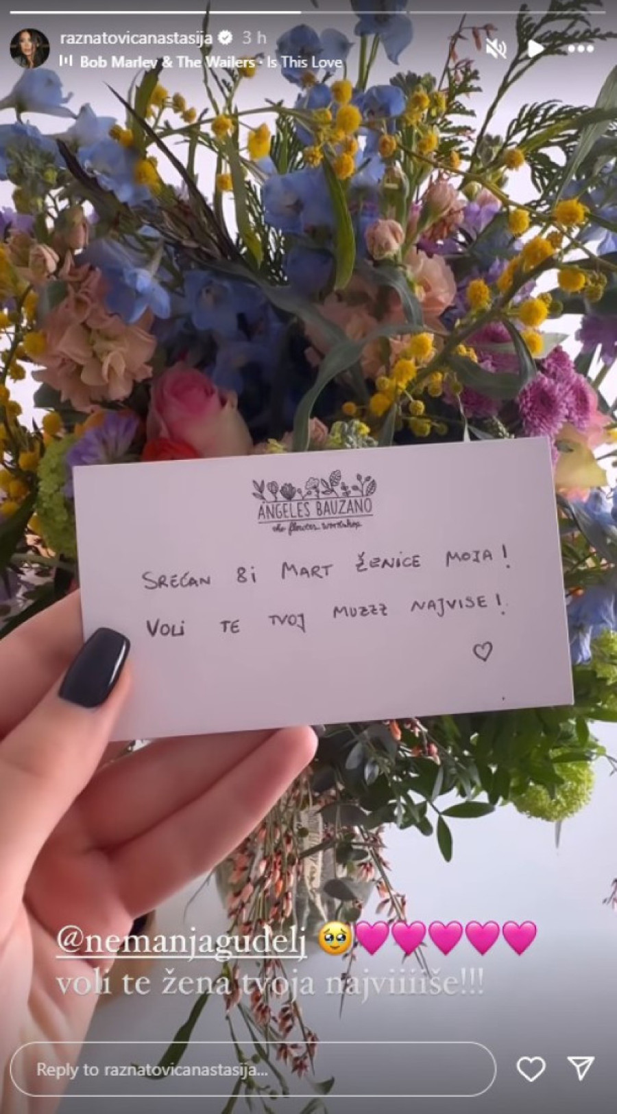 - Srećan Osmi mart ženice moja! Voli te tvoj muž najviše - piše u poruci koju je snimila i dodala: "Voli te žena tvoja najviše".
