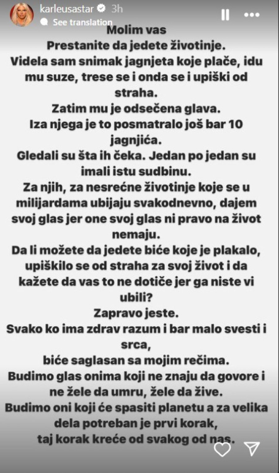 Jelena Karleuša redovno propagira zaštitu životinja na društvenim mrežama i da se ne jede meso, pa je to učinila i danas.