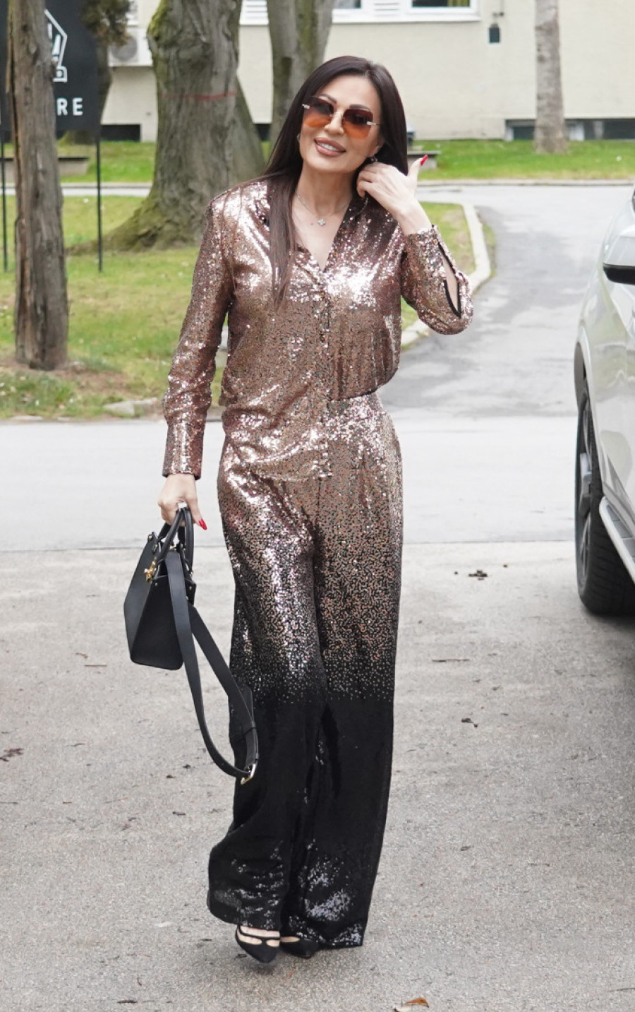 Pevačica je za ovu priliku odabrala kombinezon pun šljokica koji je u crno-zlatnoj varijanti.