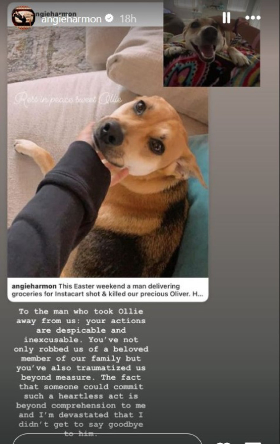 - Tokom Uskršnjeg vikenda, dostavljač za "Instacart" je pucao i ubio našeg divnog Olivera. Izašao je iz auta, dostavio hranu i onda ubio našeg psa - počela je Endži i nastavila:
