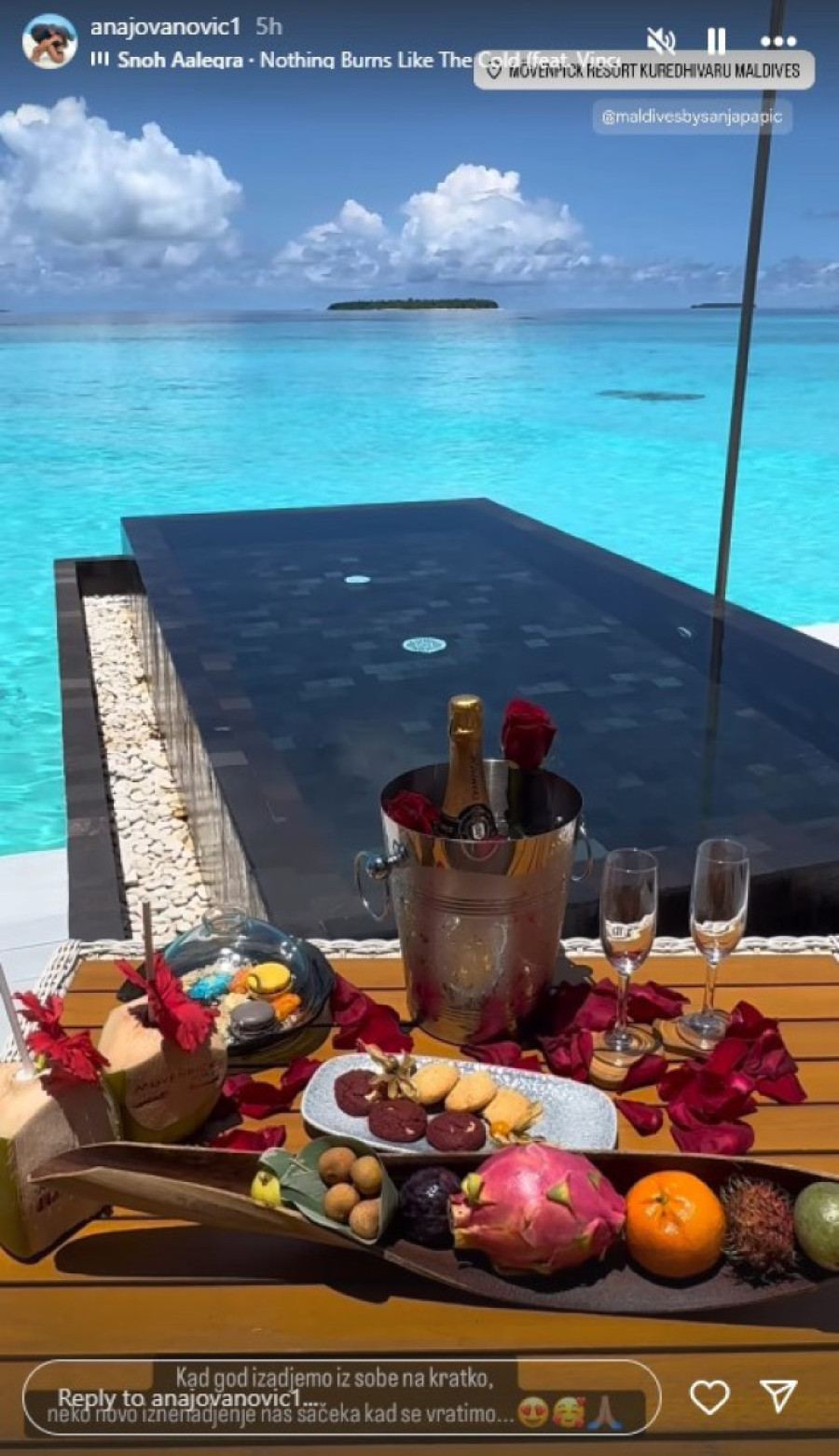 - Kad god izađemo iz sobe na kratko, neko novo iznenađenje nas sačeka kada se vratimo - napisala je Ana, pa pokazala da se ispred nje nalazi šampanjac, ali i razno voće i slatkiši.