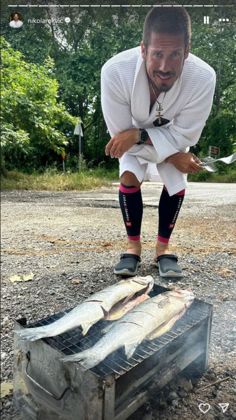 Rokvić je na sebi imao bademantil bele boje, kao i kroks papuče, pa je pozirao dok je pržio ribu na roštilju.