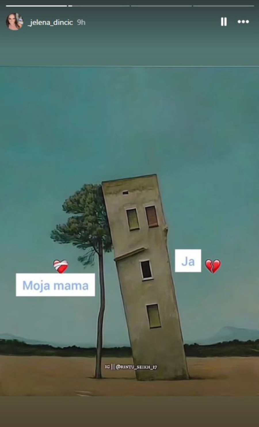Na slici vidimo drvo, koje uspravno stoji i pod vetrom, dok je na njega naslonjena zgrada. Sa strane drveta piše "moja mama" sa emotikonom zakrpljenog srca, dok sa druge strane stoji natpis "Ja", propraćen slomljenim srcem.