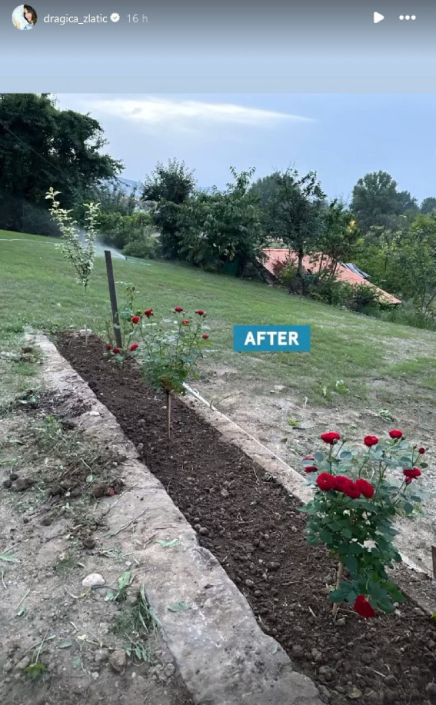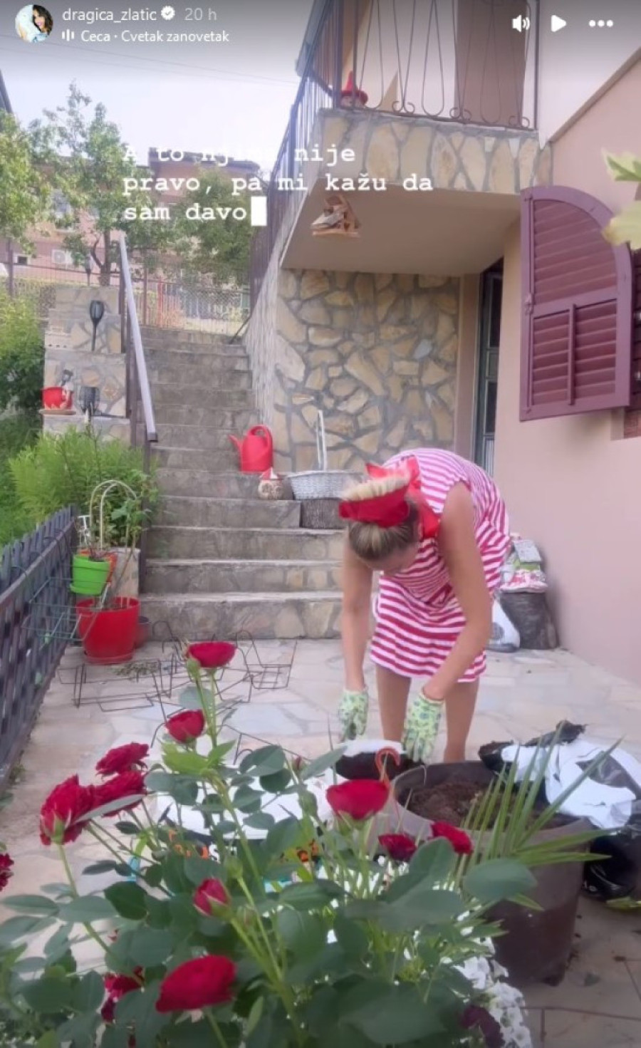 Sada je odlučila da sredi baštu i deo dvorišta, pa je pokazala deo kuće u kom rado uživa. Dragica je posadila cveće, pa je pokazala fotografije pre i posle. Međutim, ono što je najveći utisak, jeste da pevačica uživa.