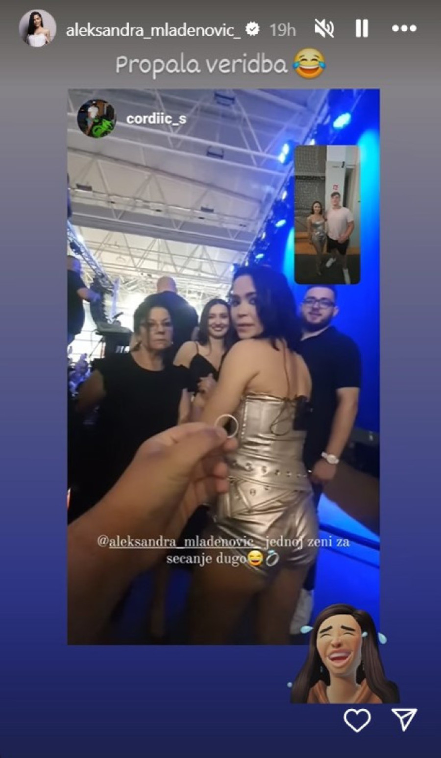 - Ne, zauzeta sam - odgovorila je Aleksandra koja je potom podelila snimak na svom nalogu, pa dodala "Propala veridba".