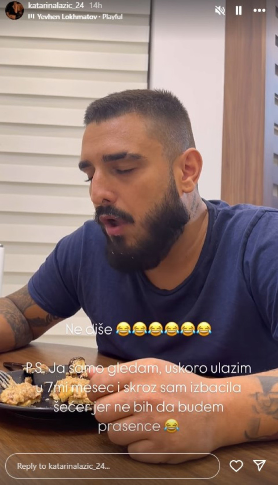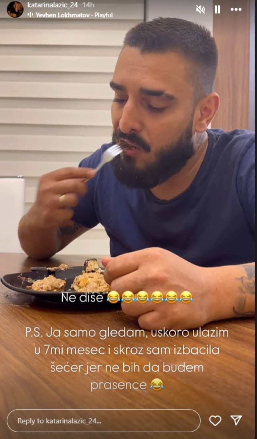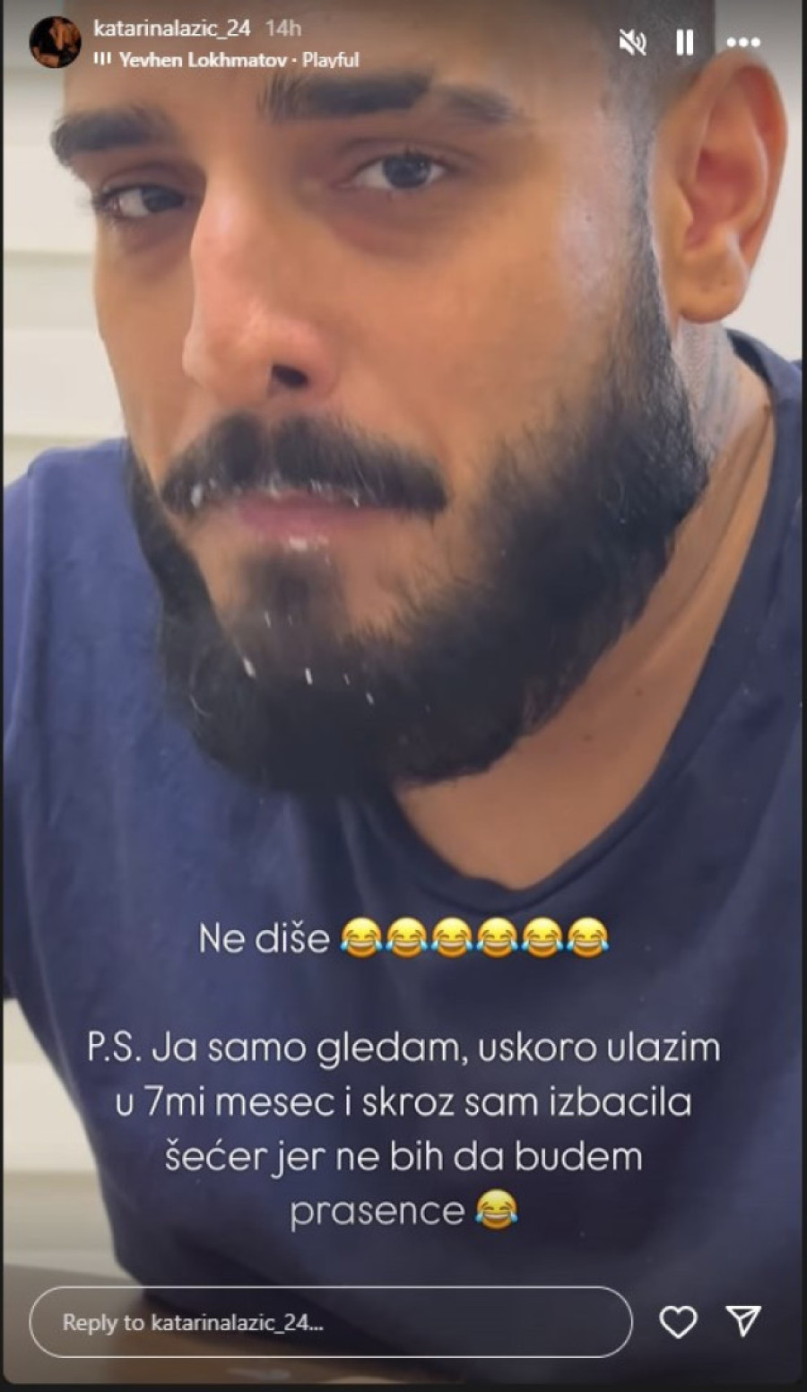 - Ne diše. Ja samo gledam, uskoro ulazim u sedmi mesec i skroz sam izbacila šećer jer ne bih da budem prasence - napisala je Katarina dok je snimala Darka.