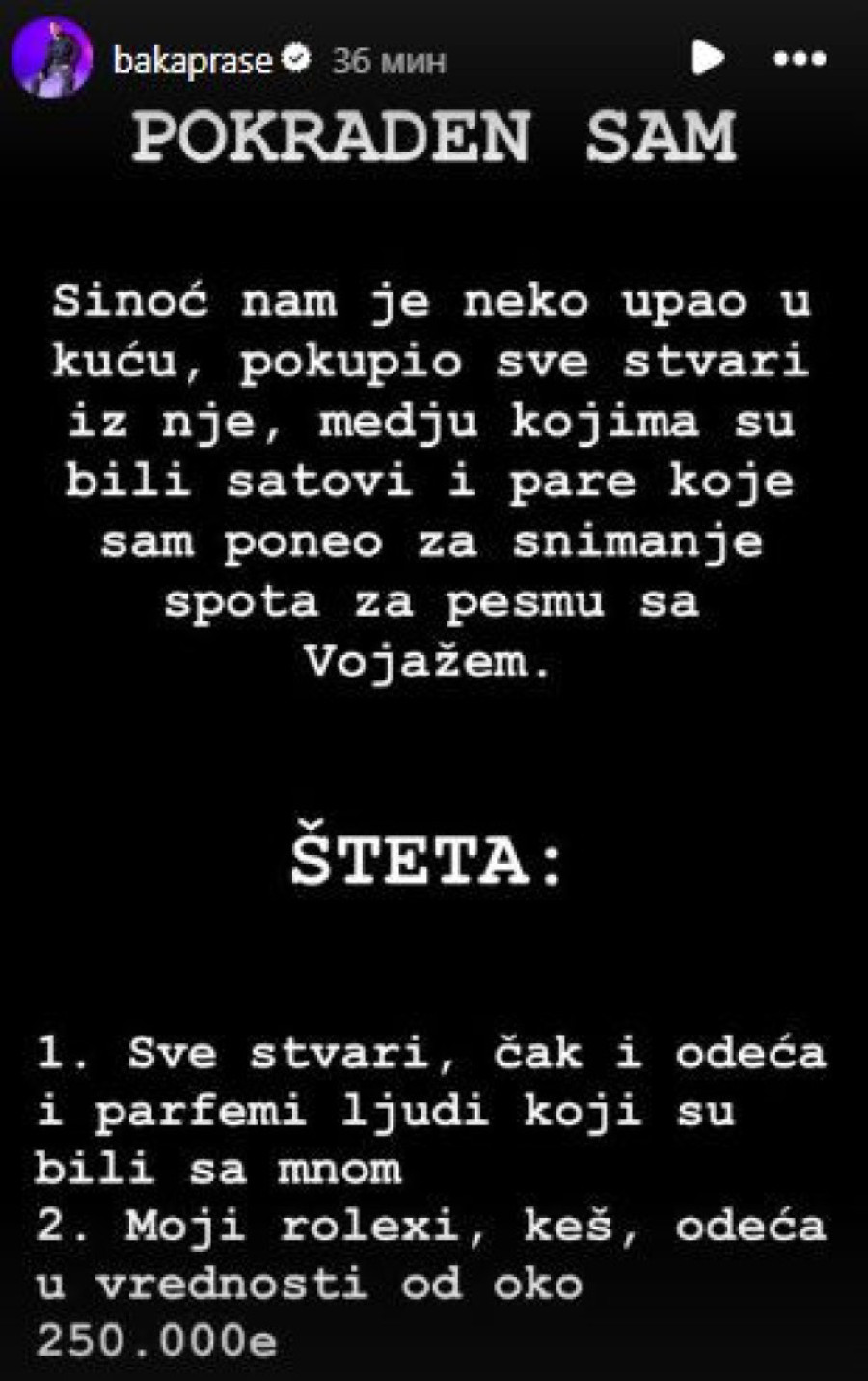 - Pokraden sam. Sinoć nam je neko upao u kuću, pokupio sve stvari iz nje, među kojima su bili i satovi i pare koje sam poneo za snimanje spota za pesmu sa Vojažem - poručio je u okviru svojih „storija" on.