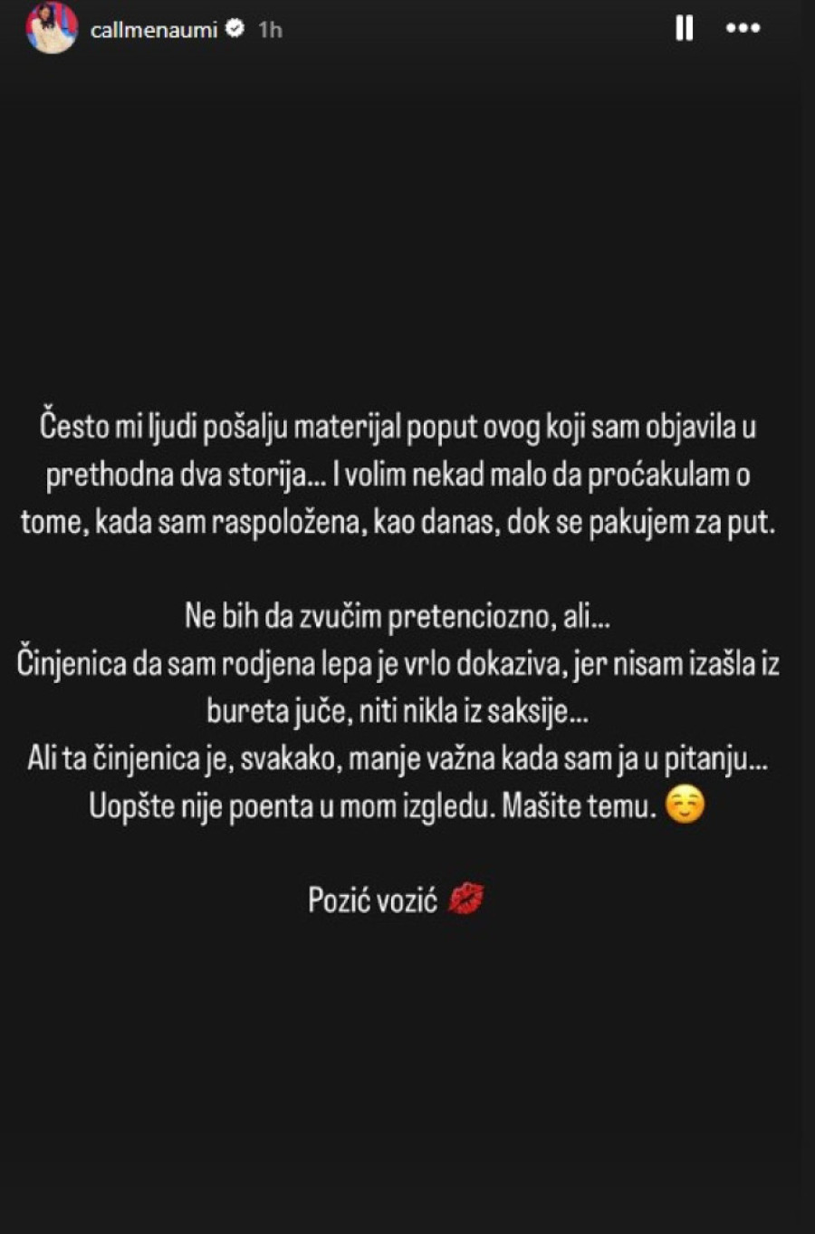 - Često mi ljudi pošalju materijal poput ovog koji sam objavila u prethodna dva storija. I volim nekad malo da proćakulam o tome, kada sam raspoložena, kao danas, dok se pakujem za put - počela je Mina, pa nastavila: