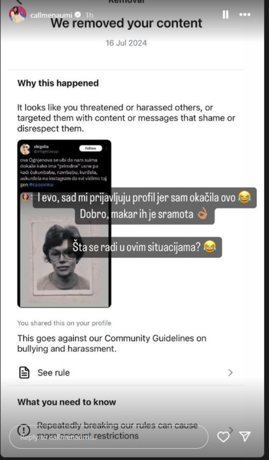 - I evo, sad mi prijavljuju profil jer sam okačila ovo. Dobro, makar ih je sramota. Šta se radi u ovim situacijama? - pitala je Mina, pa dodala: