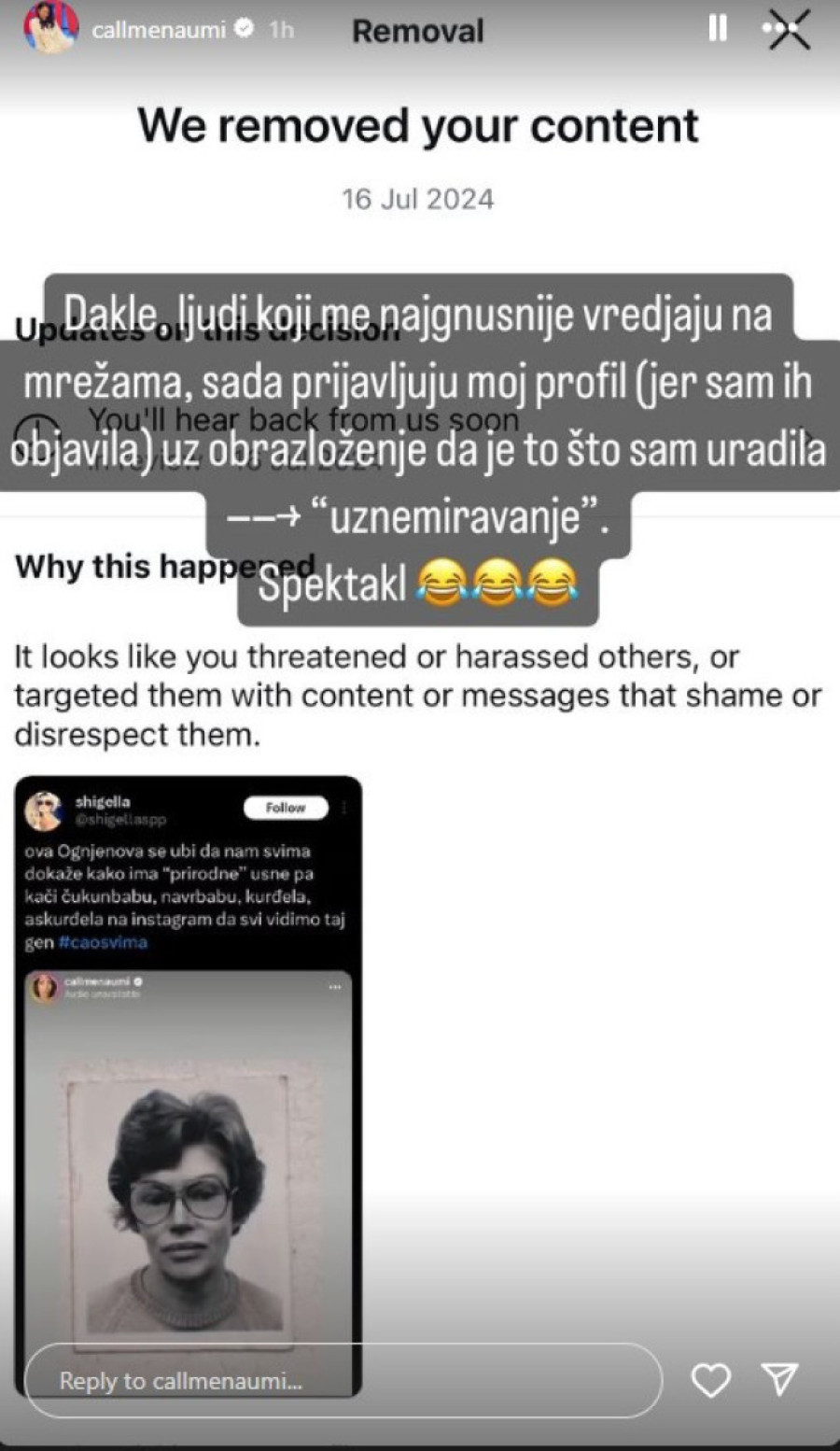 - Dakle, ljudi koji me najgnusnije vređaju na mrežama, sada prijavljuju moj profil (jer sam ih objavila) uz obrazloženje da je to što sam uradila - uznemiravanje. Spektakl.