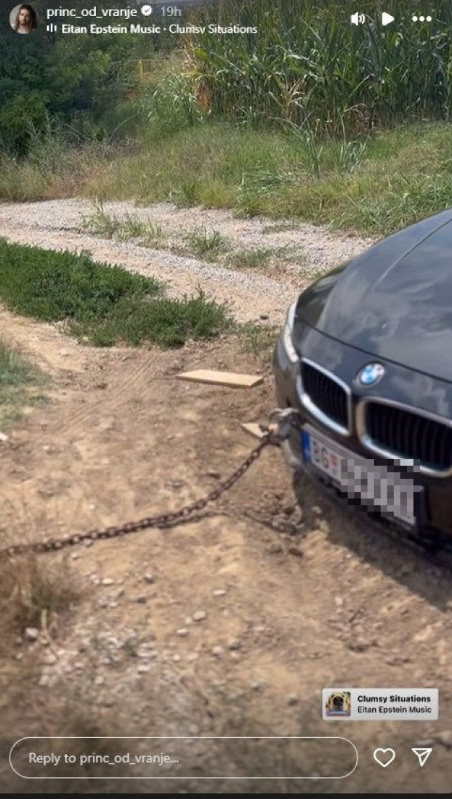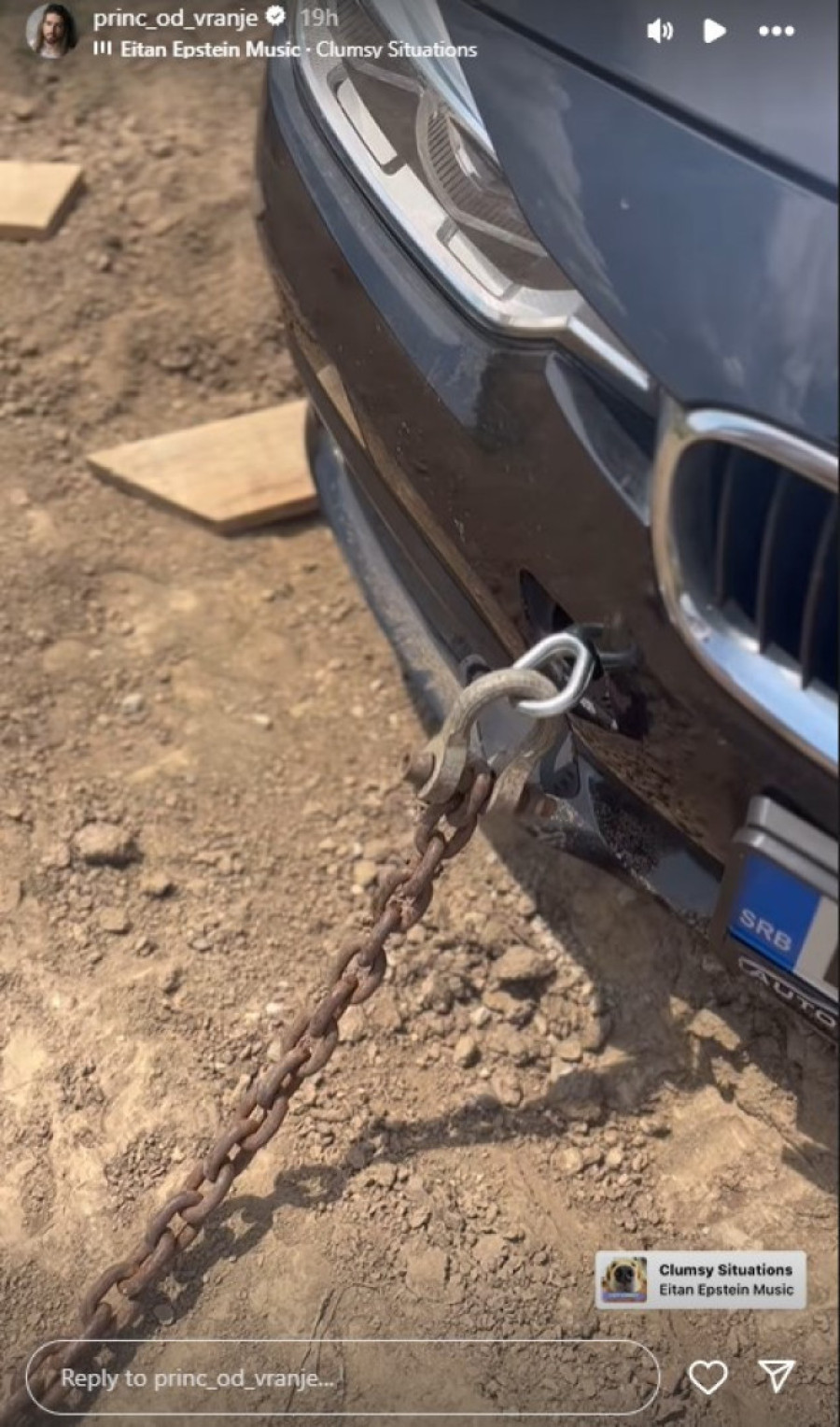 On je na svom nalogu na Instagramu pokazao da su prikačili sajlom automobil za kamion, te je to bio jedini način da izvuku auto.