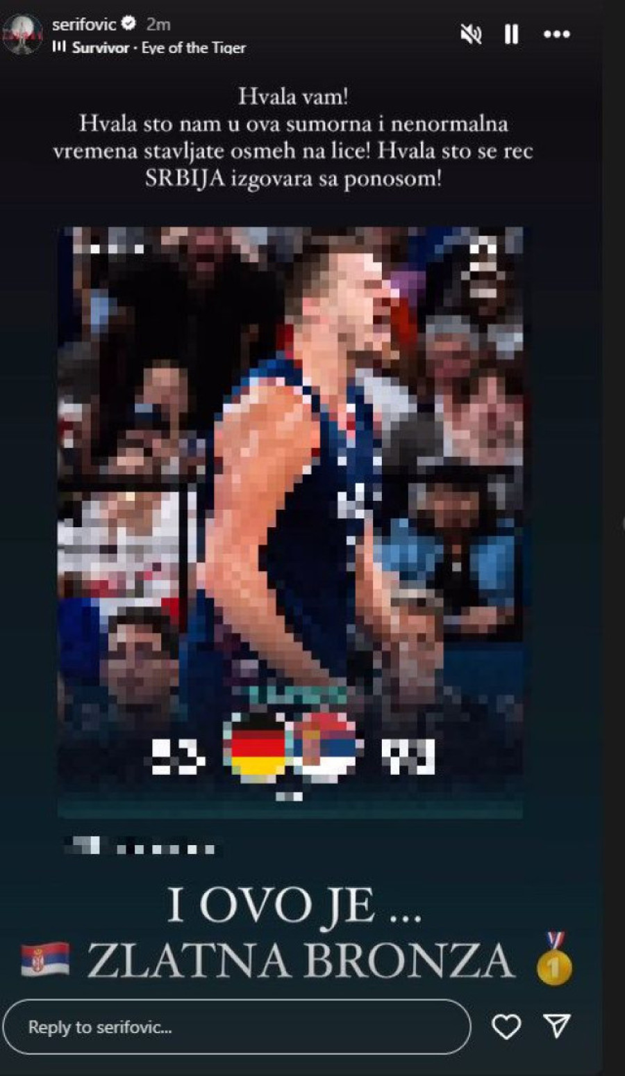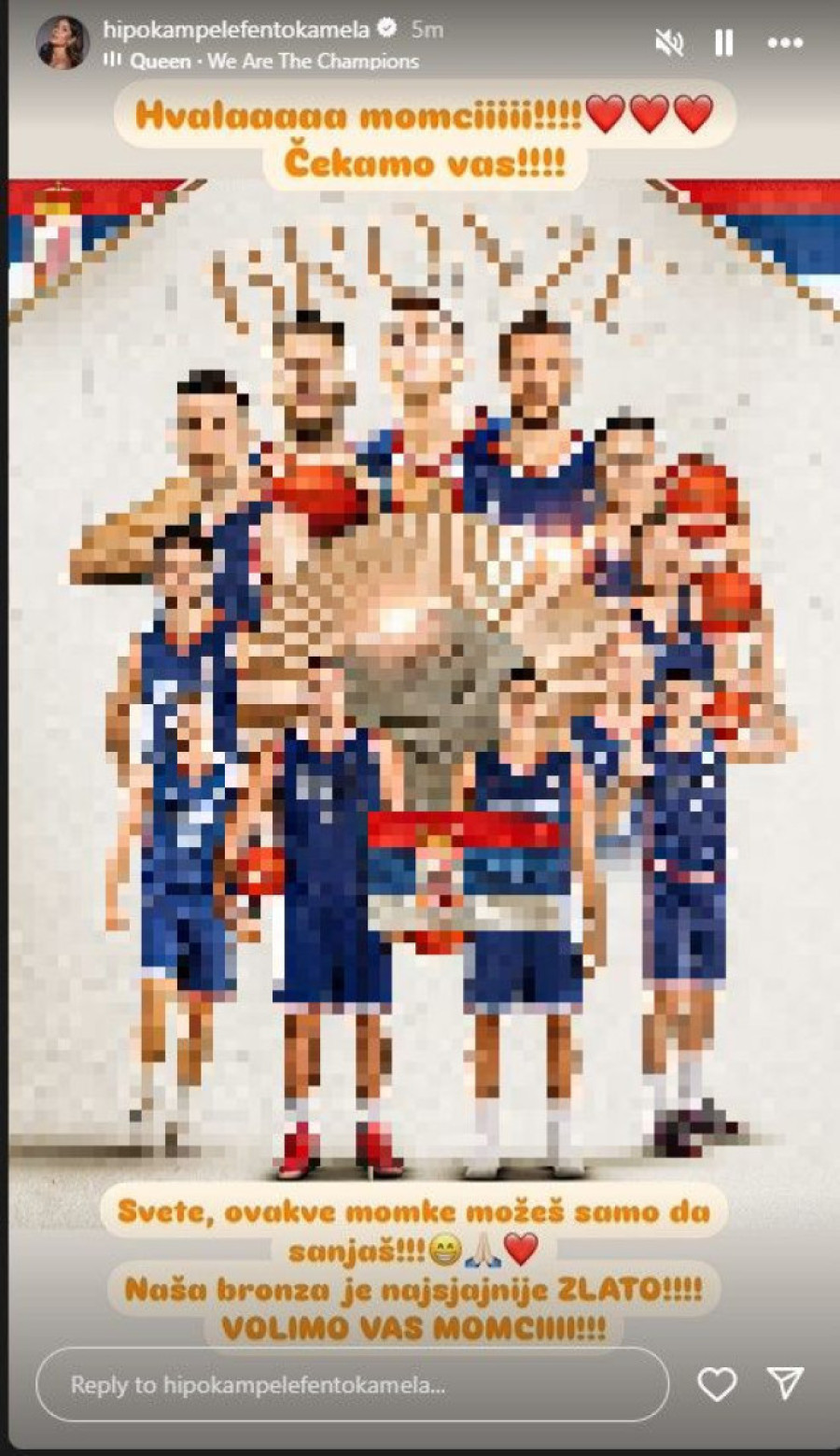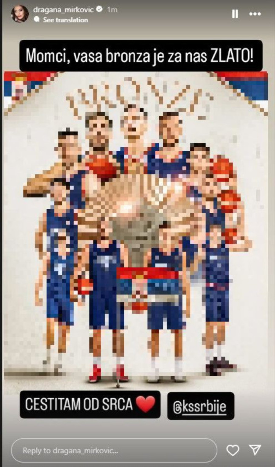 - Hvala vam! Hvala što nam u ova sumorna i nenormalna vremena stavljate osmeh na lice! Hvala što se reč Srbija izgovara sa ponosom. I ovo je zlatna bronza! - poručila je Marija našim košarkašima, a oglasila se i Dragana Mirković: