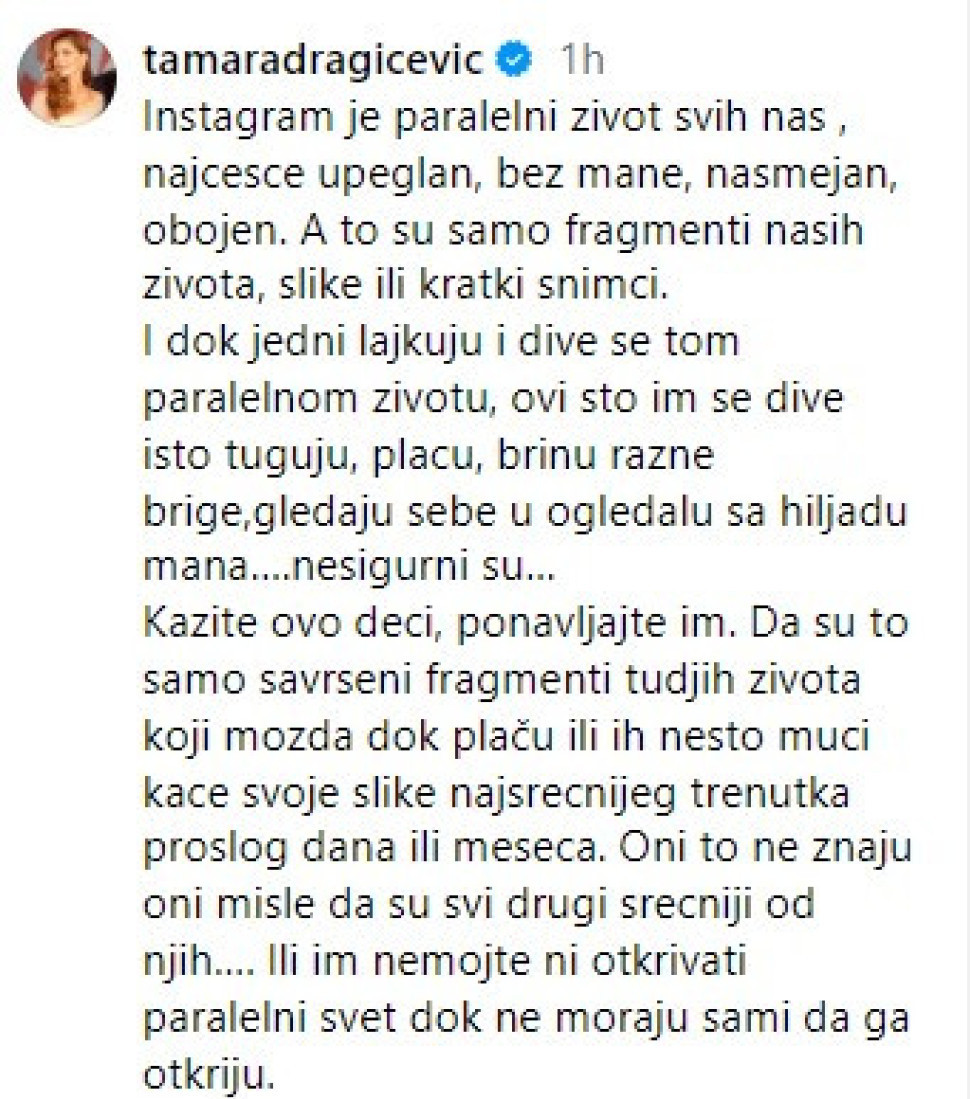- Instagram je paralelni život svih nas, najčešće upeglan, bez mane, nasmejan, obojen. A to su samo fragmenti naših života, slike ili kratki snimci. I dok jedni lajkuju i dive se tom paralelnom životu, ovi sto im se dive isto tuguju, plaču, brinu razne brige, gledaju sebe u ogledalu sa hiljadu mana….nesigurni su… Kažite ovo deci, ponavljajte im. Da su to samo savršeni fragmenti tuđih života koji možda dok plaču ili ih nešto muči kače svoje slike najsrećnijeg trenutka prošlog dana ili meseca. Oni to ne znaju oni misle da su svi drugi srećniji od njih…. Ili im nemojte ni otkrivati paralelni svet dok ne moraju sami da ga otkriju - napisala je Dragičevićeva na svom Instagram profilu i dodala:
