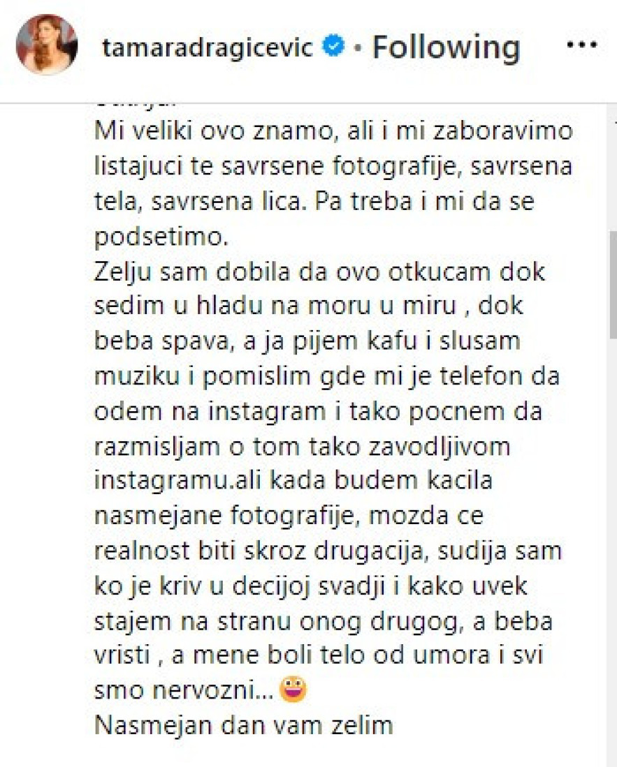 - Mi veliki ovo znamo, ali i mi zaboravimo listajući te savršene fotografije, savršena tela, savršena lica. Pa treba i mi da se podsetimo. Želju sam dobila da ovo otkucam dok sedim u hladu na moru u miru, dok beba spava, a ja pijem kafu i slušam muziku i pomislim gde mi je telefon da odem na Instagram i tako počnem da razmišljam o tom tako zavodljivom Instagramu. Ali kada budem kačila nasmejane fotografije, možda će realnost biti skroz drugačija, sudija sam ko je kriv u dečijoj svađi i kako uvek stajem na stranu onog drugog, a beba vrištI, a mene boli telo od umora i svi smo nervozni… Nasmejan dan vam želim.