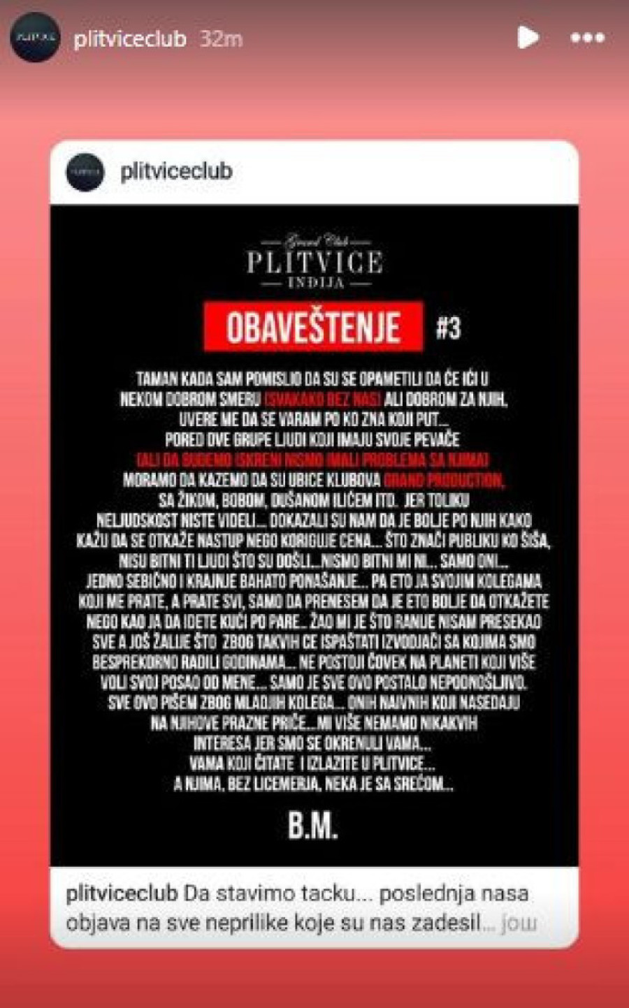 - Žao mi je što ranije nisam presekao sve, a još žalije zbog što će zbog takvih ispaštati izbođači sa kojima smo besprekorno radili godinama. Samo je sve ovo postalo nepodnošljivo - dodao je potom on, objašnjavajući da sve ovo piše zbog „mlađih kolega koji, naivni, nasedaju na njihove prazne priče".