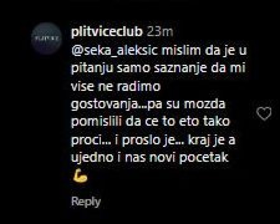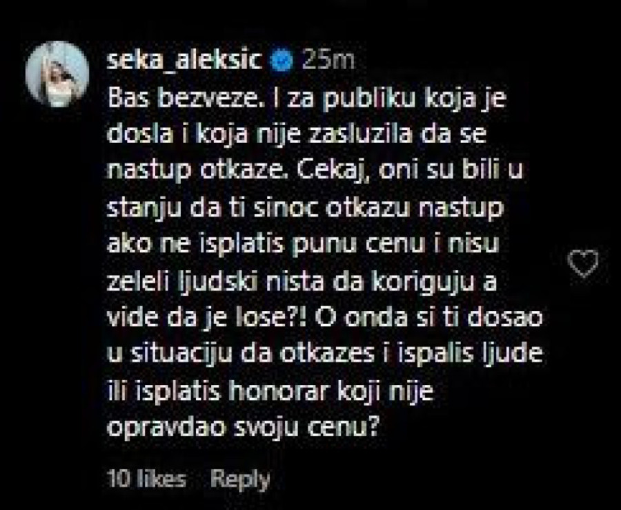 Pevačica Seka Aleksić, sa druge strane, nije mogla a da ne odreaguje na tvrdnje vlasnika kluba.